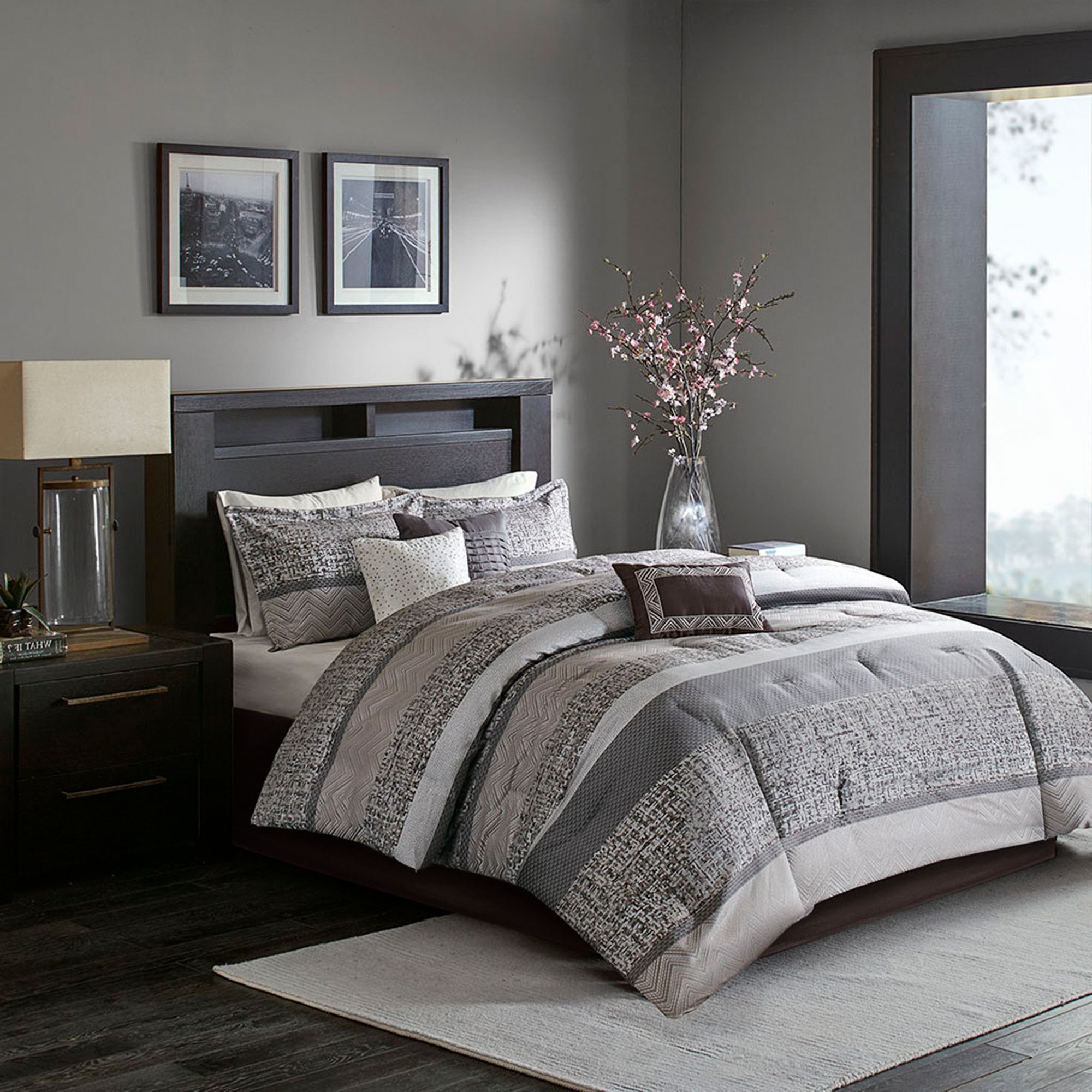 Melody Gray Taupe Striped 7-Piece Cal King Comforter Bed Set