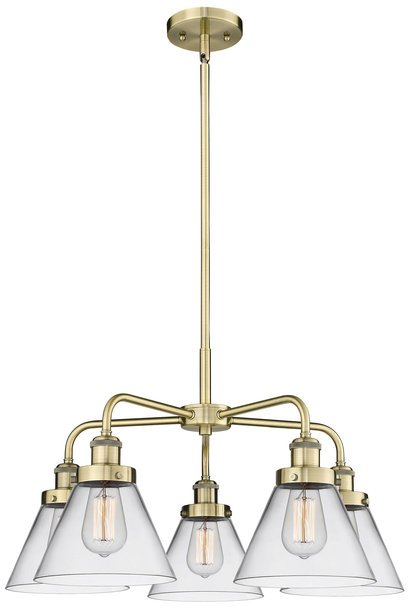 Cone 25.75"W 5 Light Antique Brass Stem Hung Chandelier w/ Clear Shade