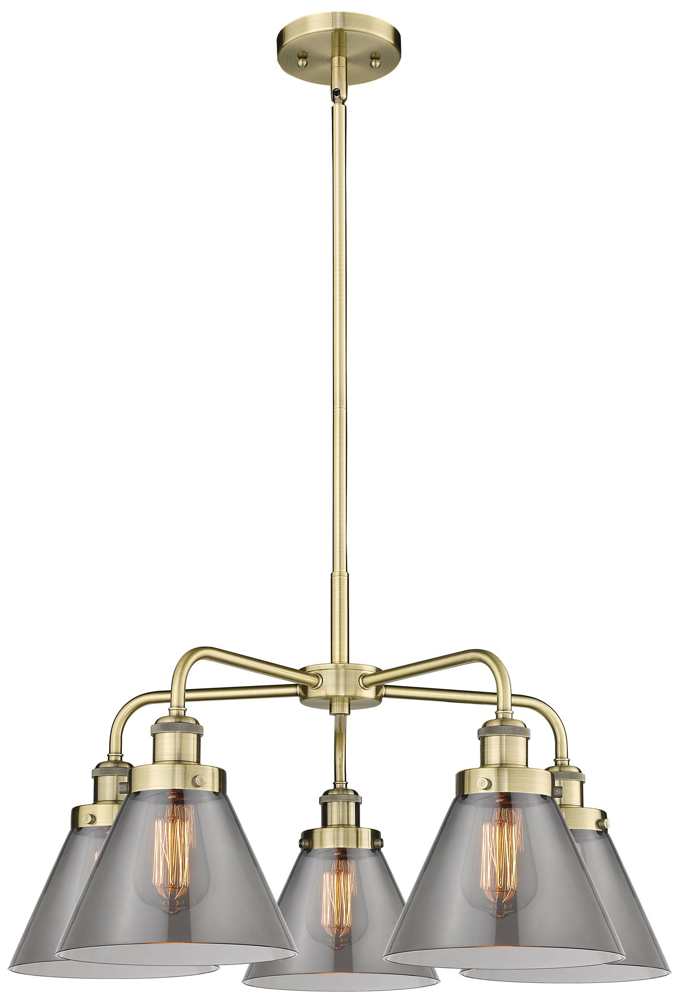 Cone 25.75"W 5 Light Antique Brass Stem Hung Chandelier w/ Smoke Shade