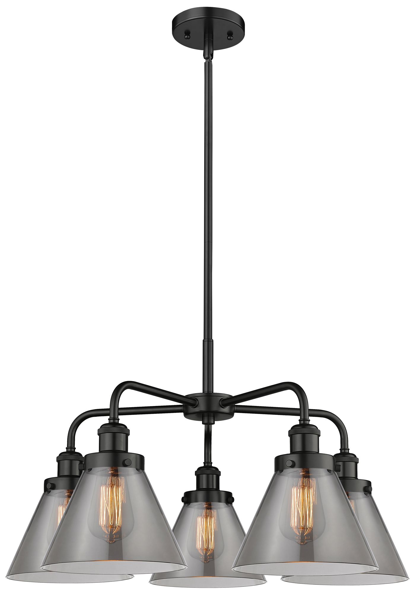 Cone 25.75"W 5 Light Matte Black Stem Hung Chandelier w/ Smoke Glass S