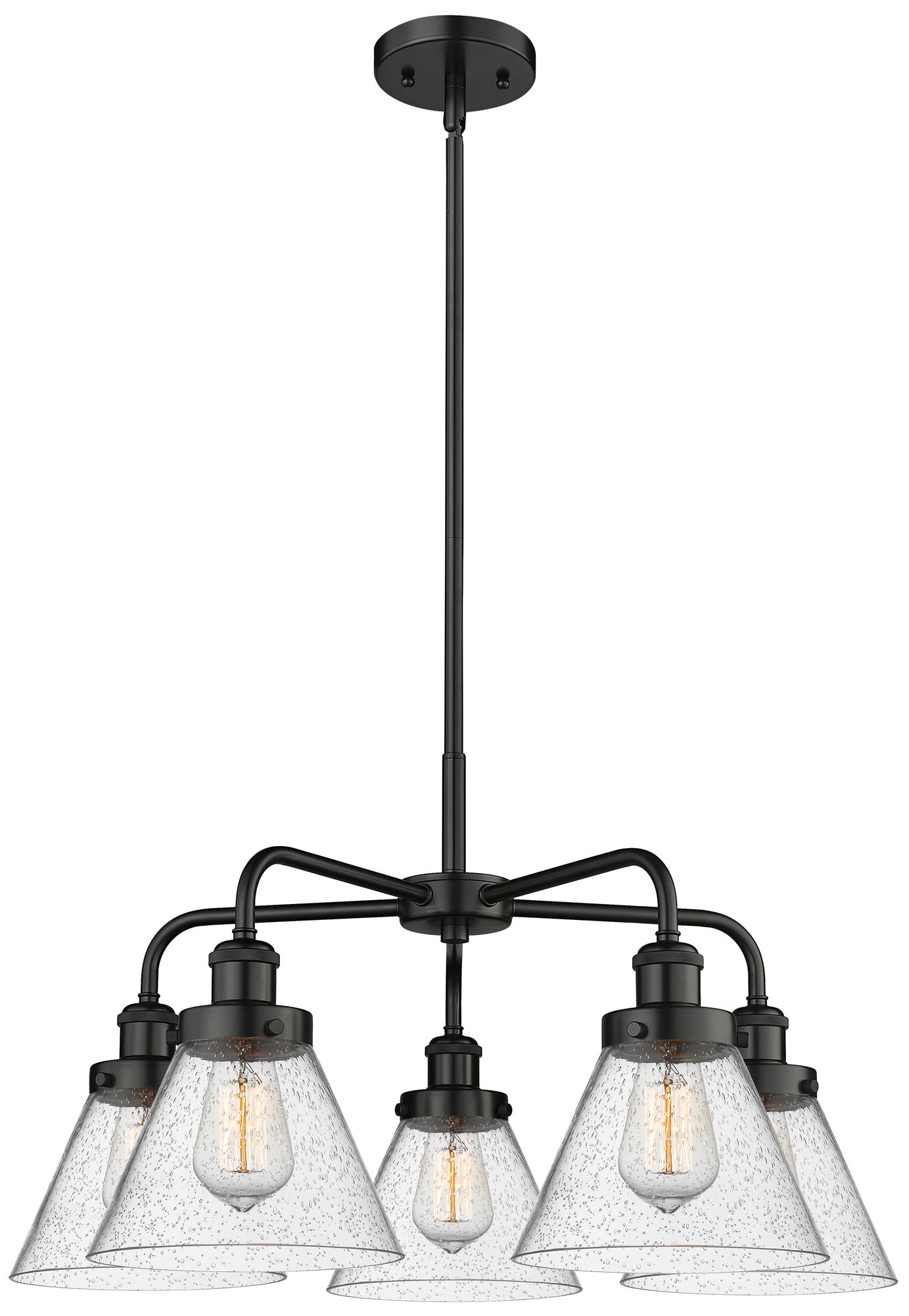 Cone 25.75"W 5 Light Matte Black Stem Hung Chandelier w/ Seedy Glass S
