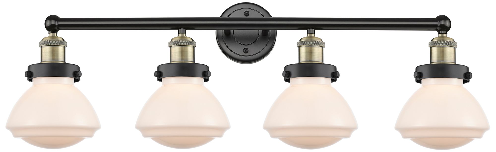 Olean 33.5"W 4 Light Black Antique Brass Bath Vanity Light With White