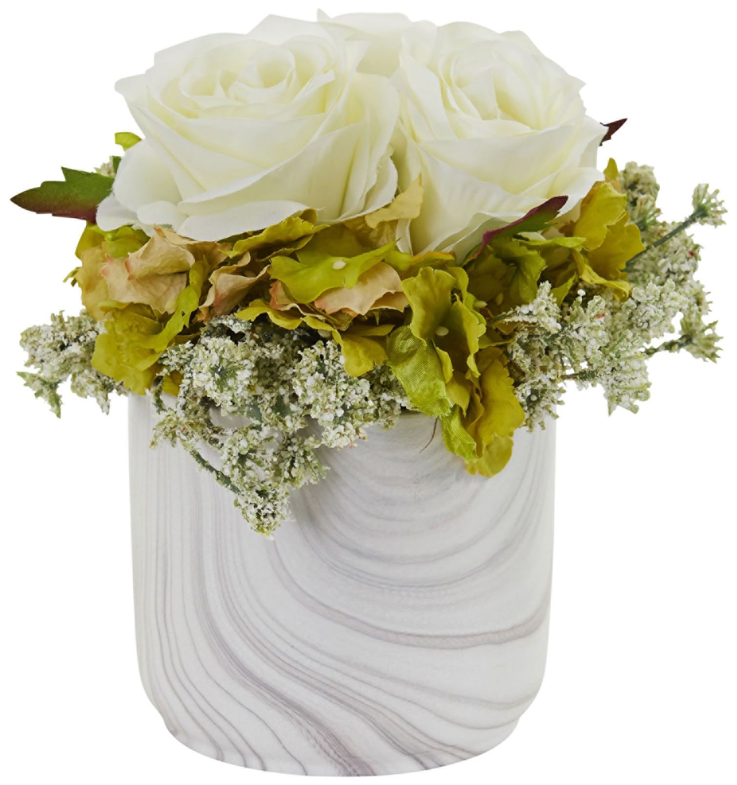 White Rose and Hydrangea 8"H Faux Flowers in Marble Vase