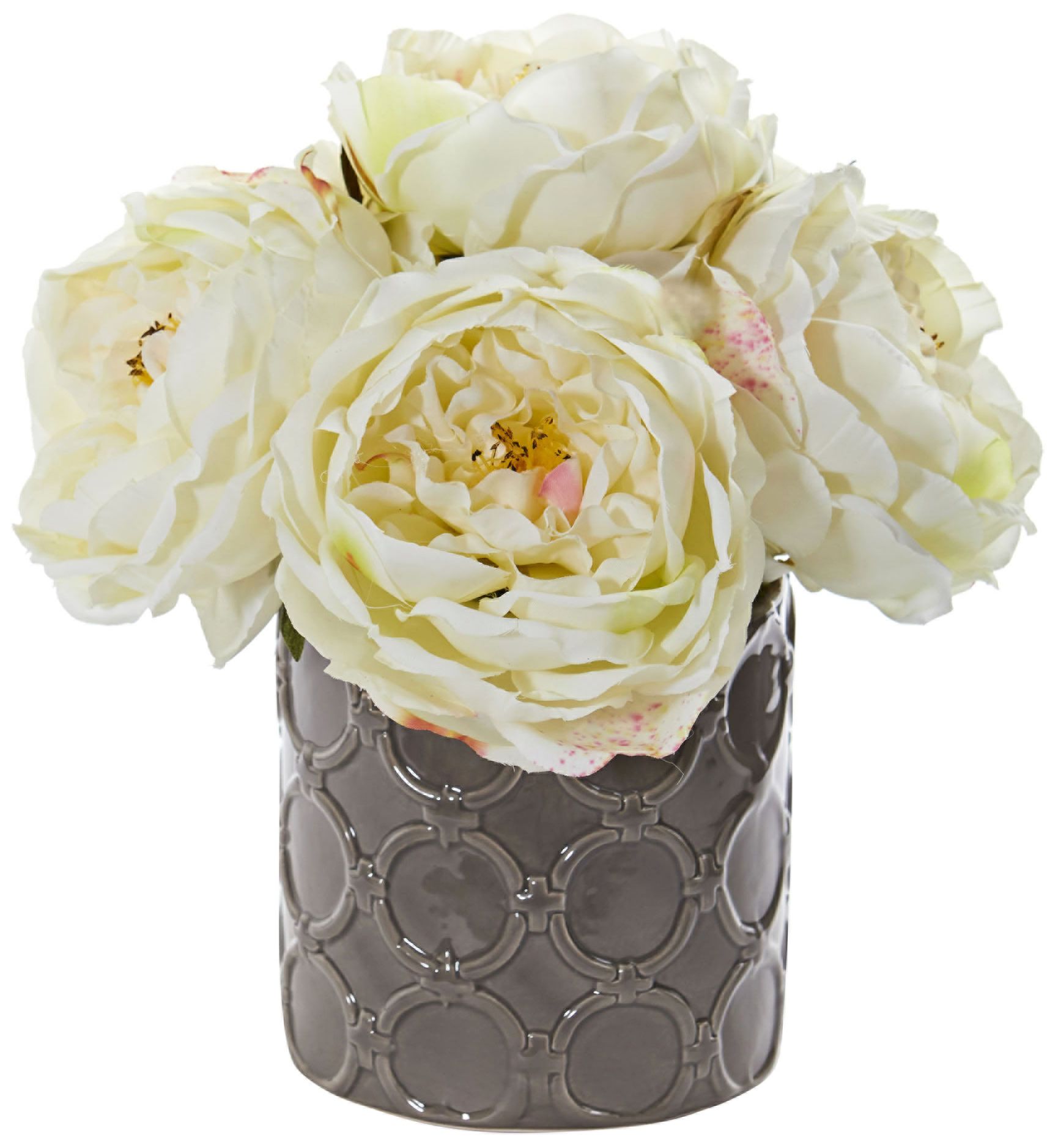 Large White Peony 10" High Faux Flowers in Gray Ceramic Vase