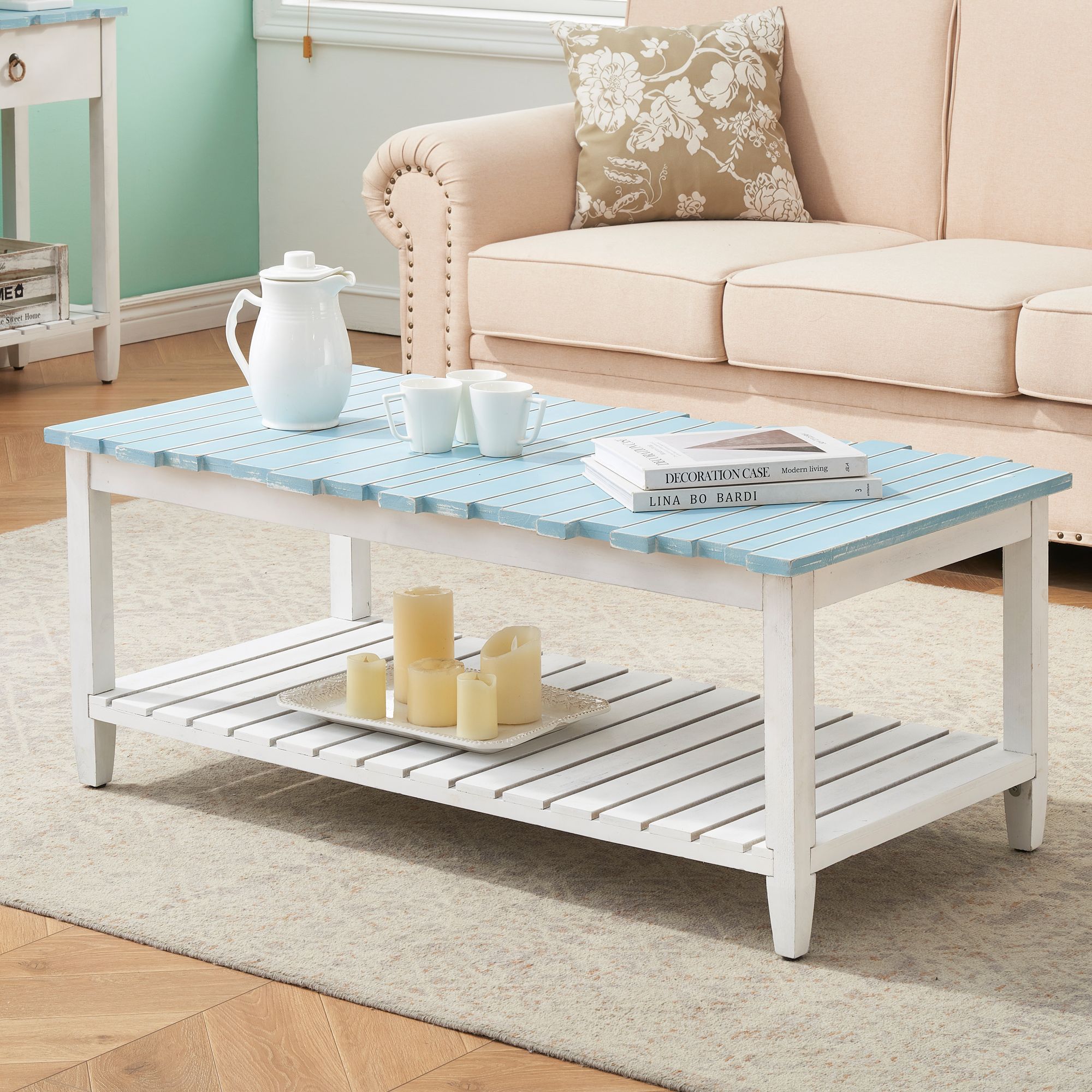 Boardwalk 45"W White Blueish Green 1-Shelf Cocktail Table