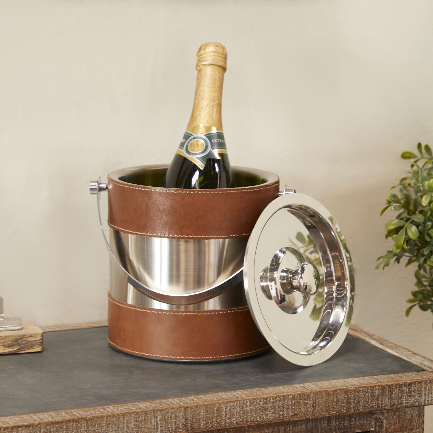 Brown Leather Modern Ice Bucket, 8" x 7" x 12"