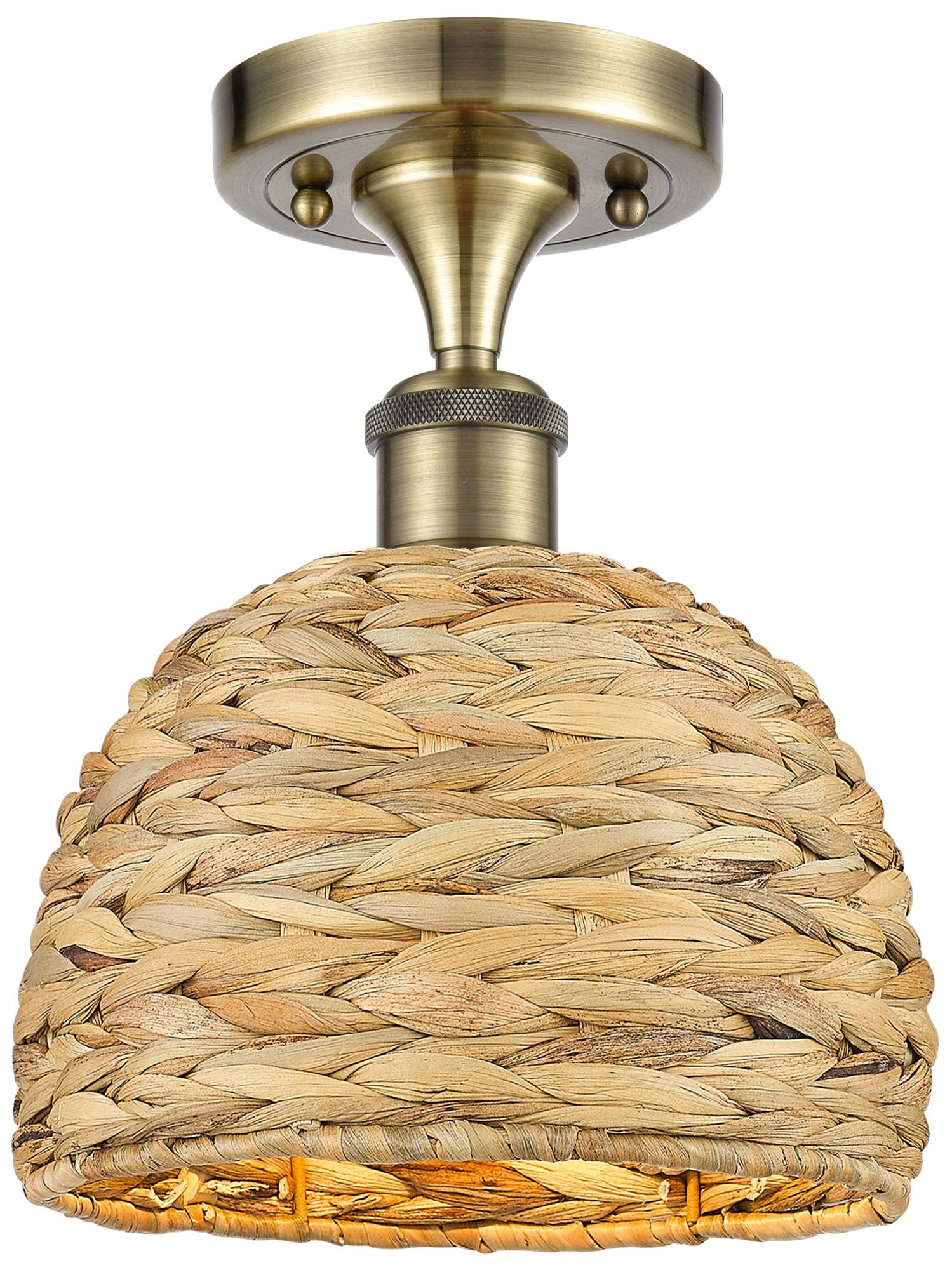 Woven Rattan 8" Wide Antique Brass Semi.Flush Mount With Natural Shade