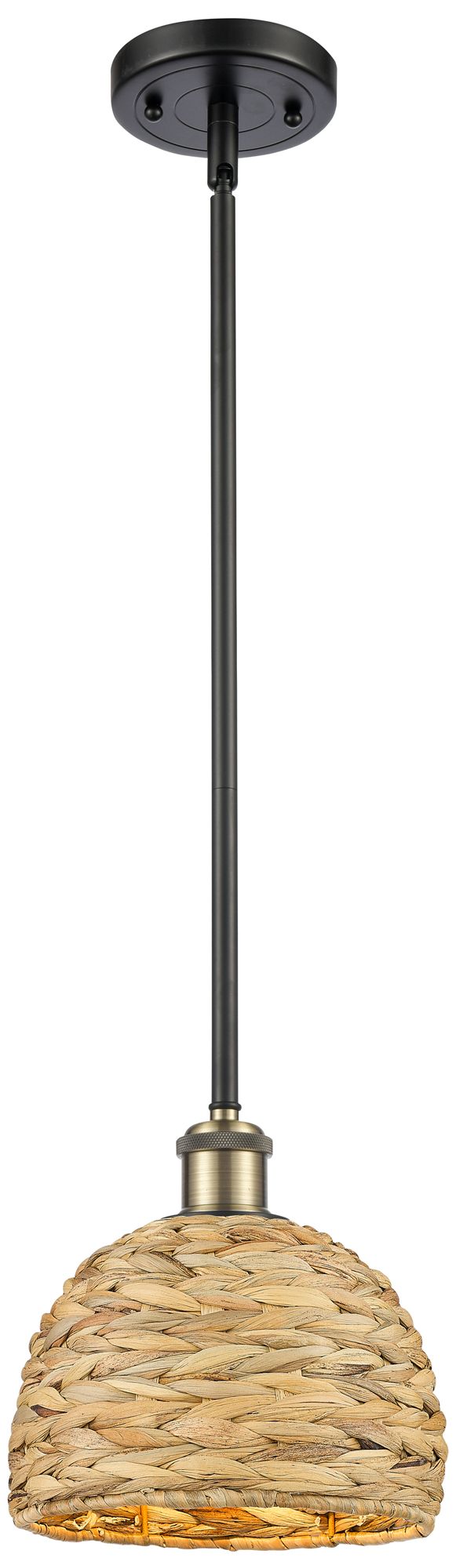 Woven Rattan 8"W Black Antique Brass Stem Hung Pendant With Natural Sh