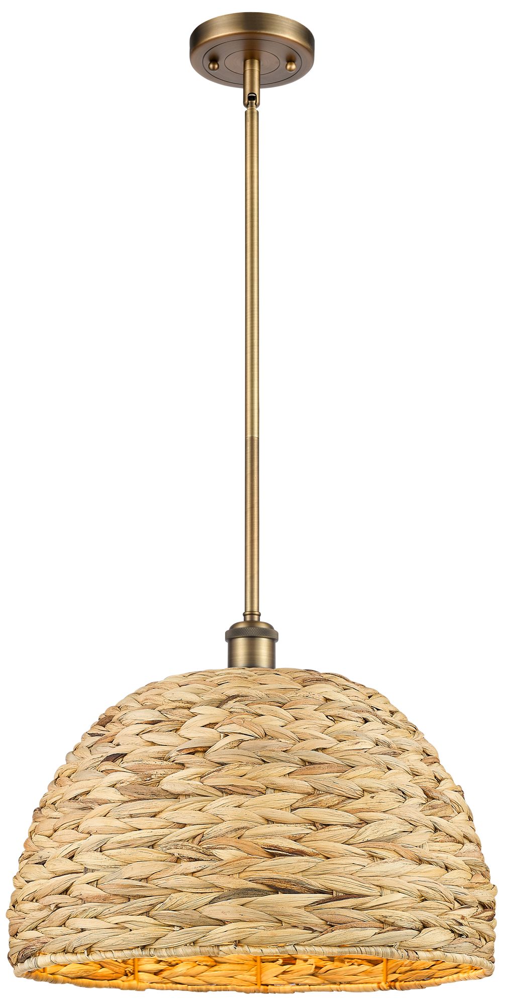 Woven Rattan 15.75" Wide Brushed Brass Stem Hung Pendant With Natural