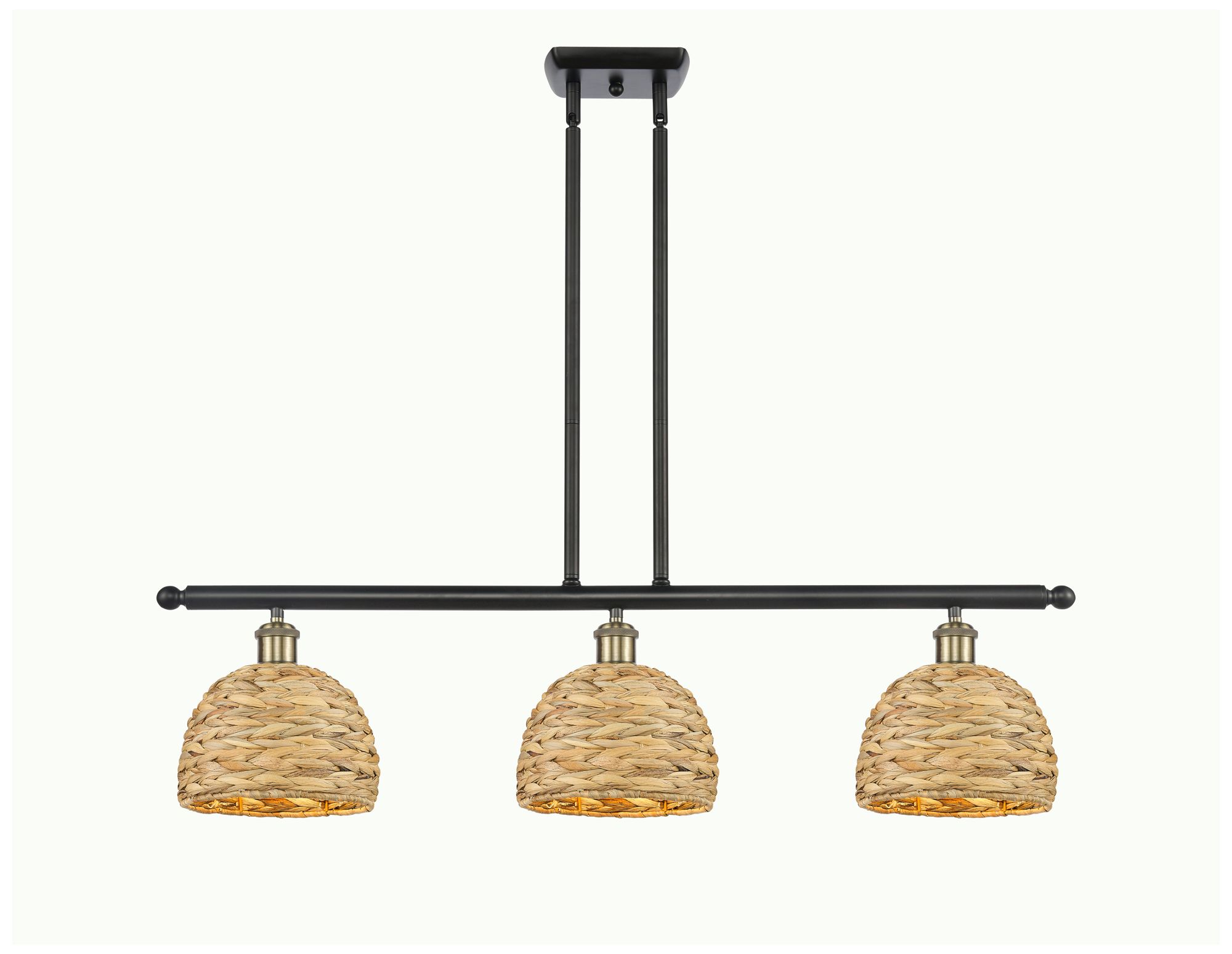 Woven Rattan 36"W 3 Light Black Brass Stem Island Light w/ Natural Sha