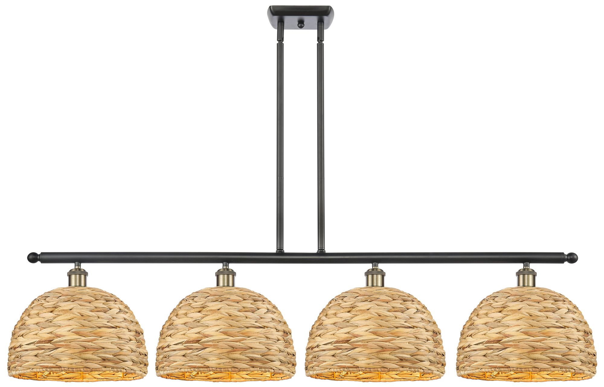 Woven Rattan 50"W 4 Light Black Brass Stem Island Light w/ Natural Sha