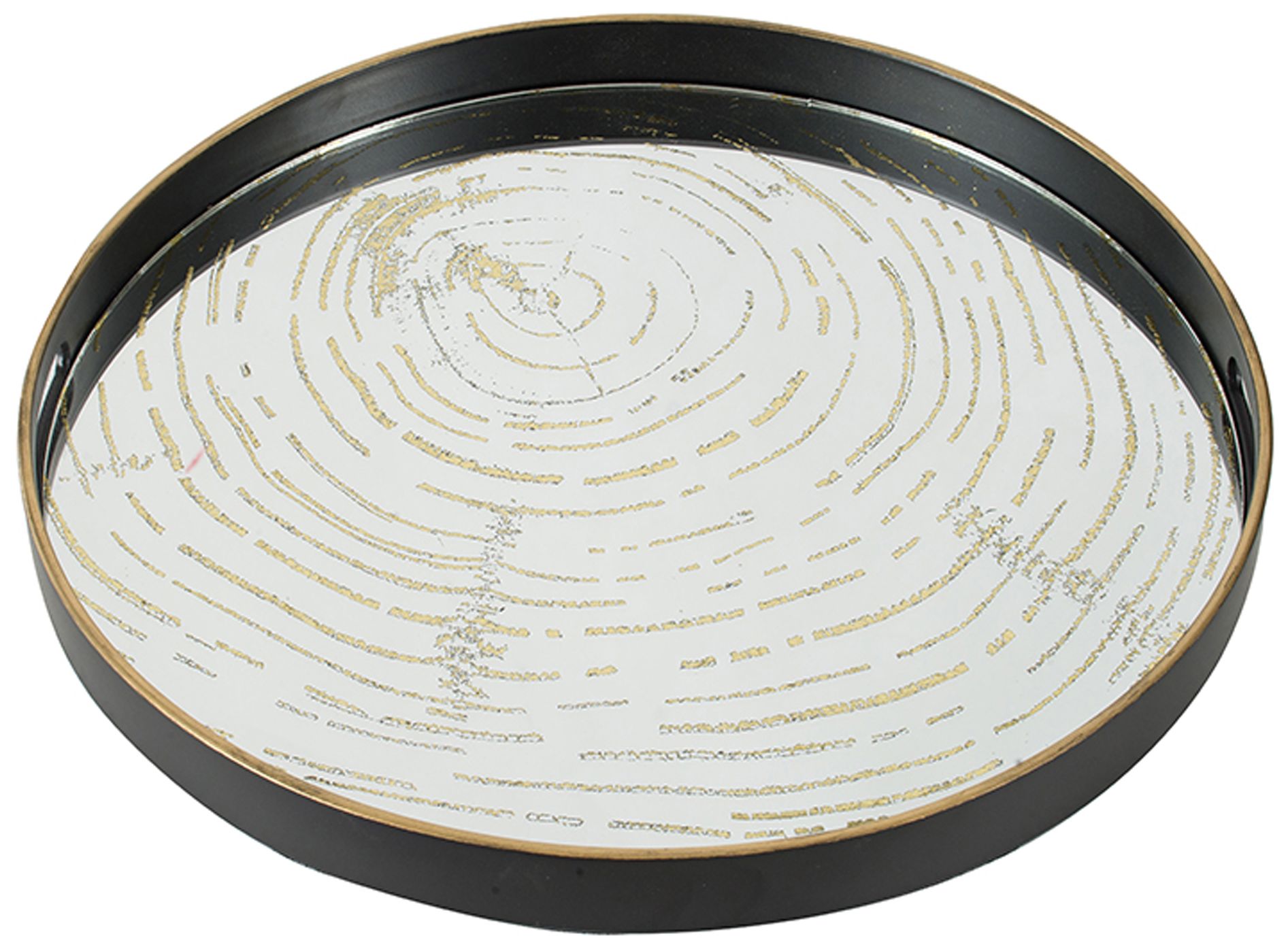 18" Wide Round Black and Gold Mirrored Decorative Tray with Wood Desig