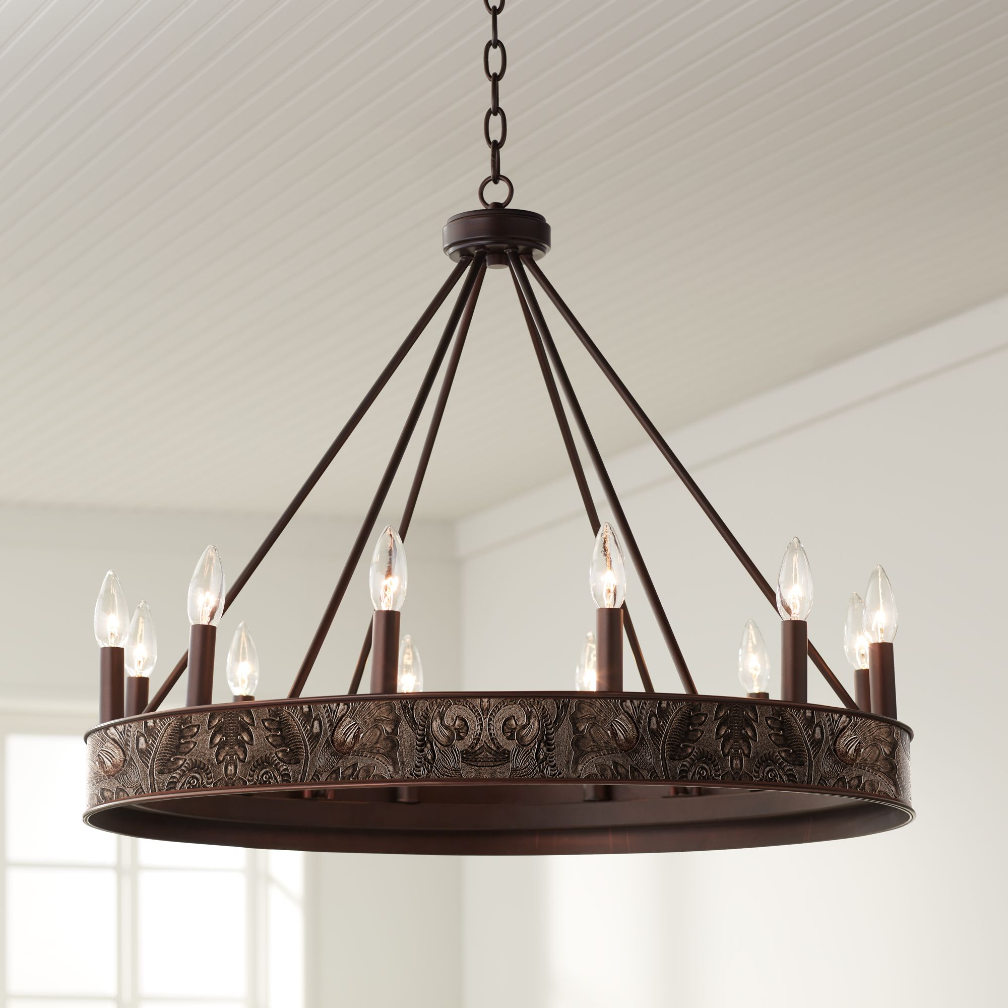 Embossed Leather Jessa 29 1/2" Wide Bronze Wheel Chandelier