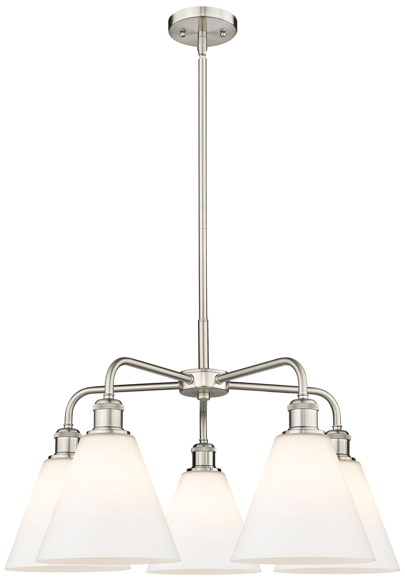 Berkshire 26"W 5 Light Satin Nickel Stem Hung Chandelier With White Sh