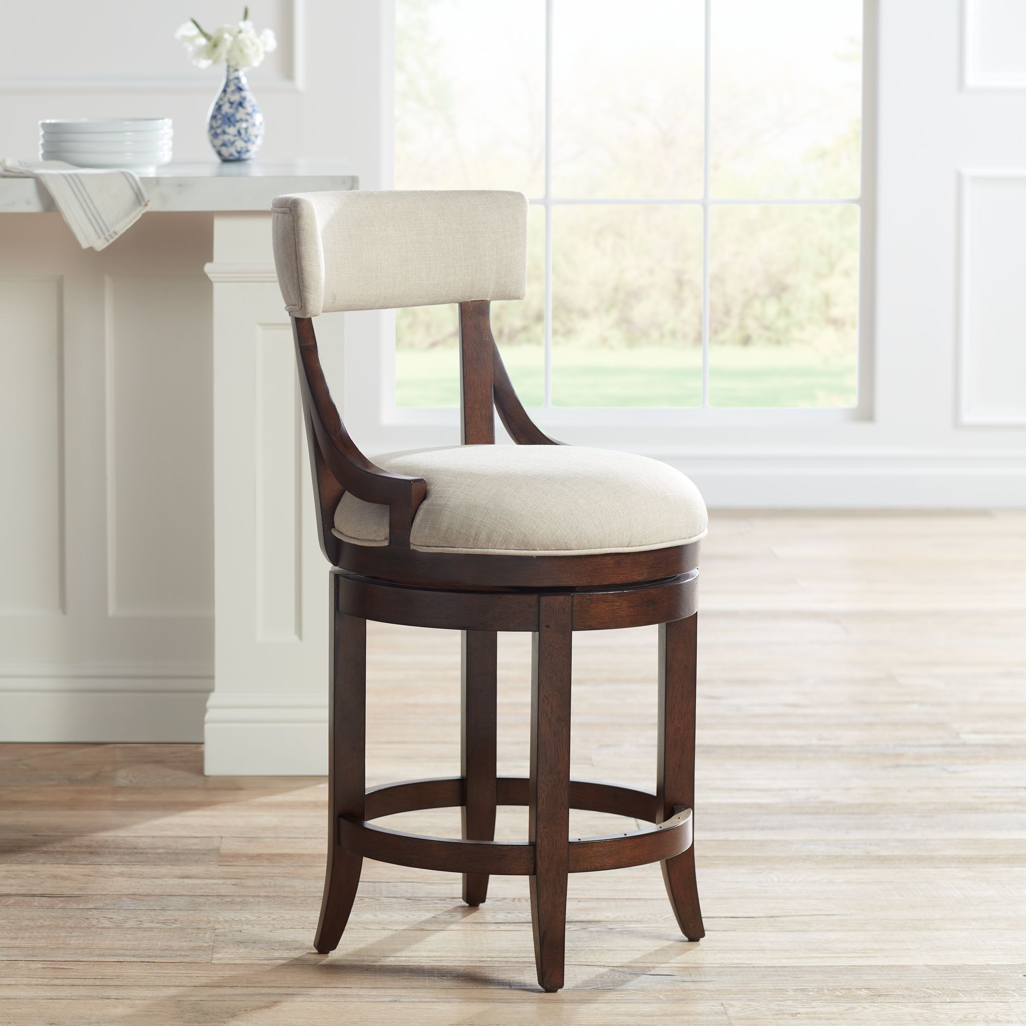 Lev 24" Seat Height Distressed Walnut Linen Swivel Counter Stool