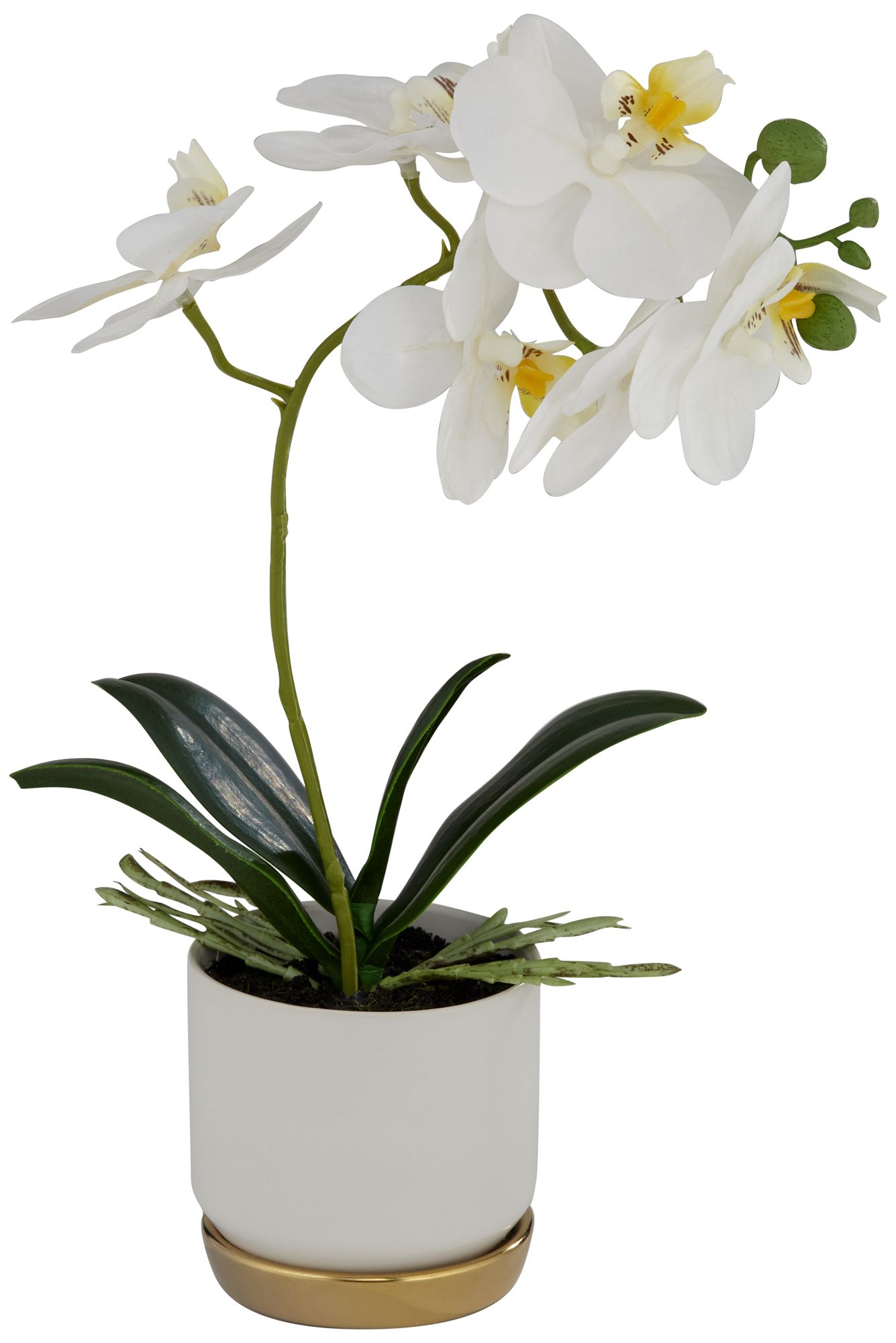 White and Yellow Orchid 12" High Faux Flowers in Ceramic Pot