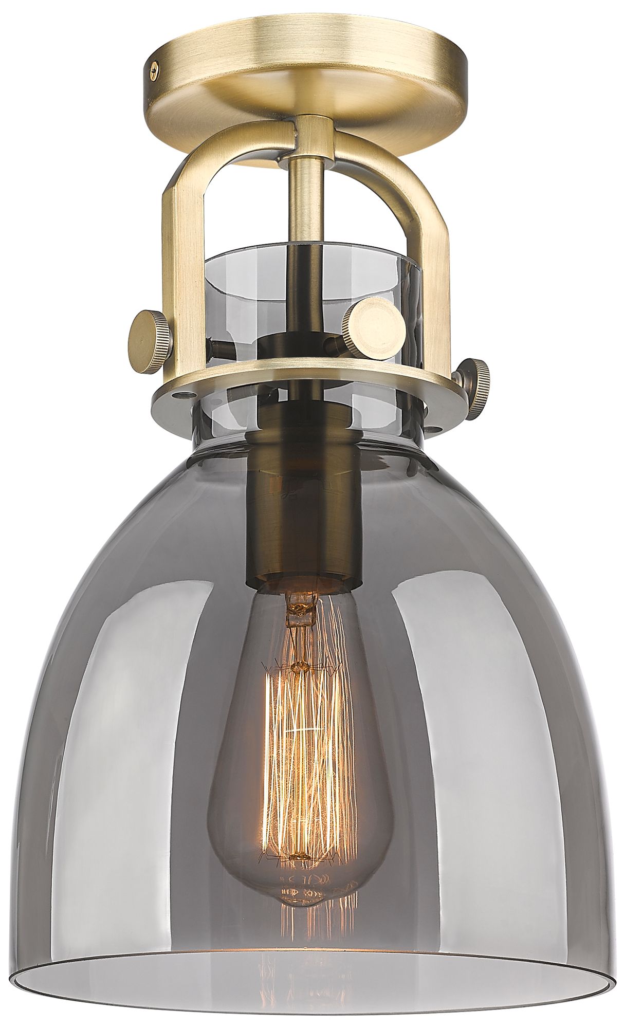 Newton Bell 8" Wide Brushed Brass Flush Mount with Smoke Shade