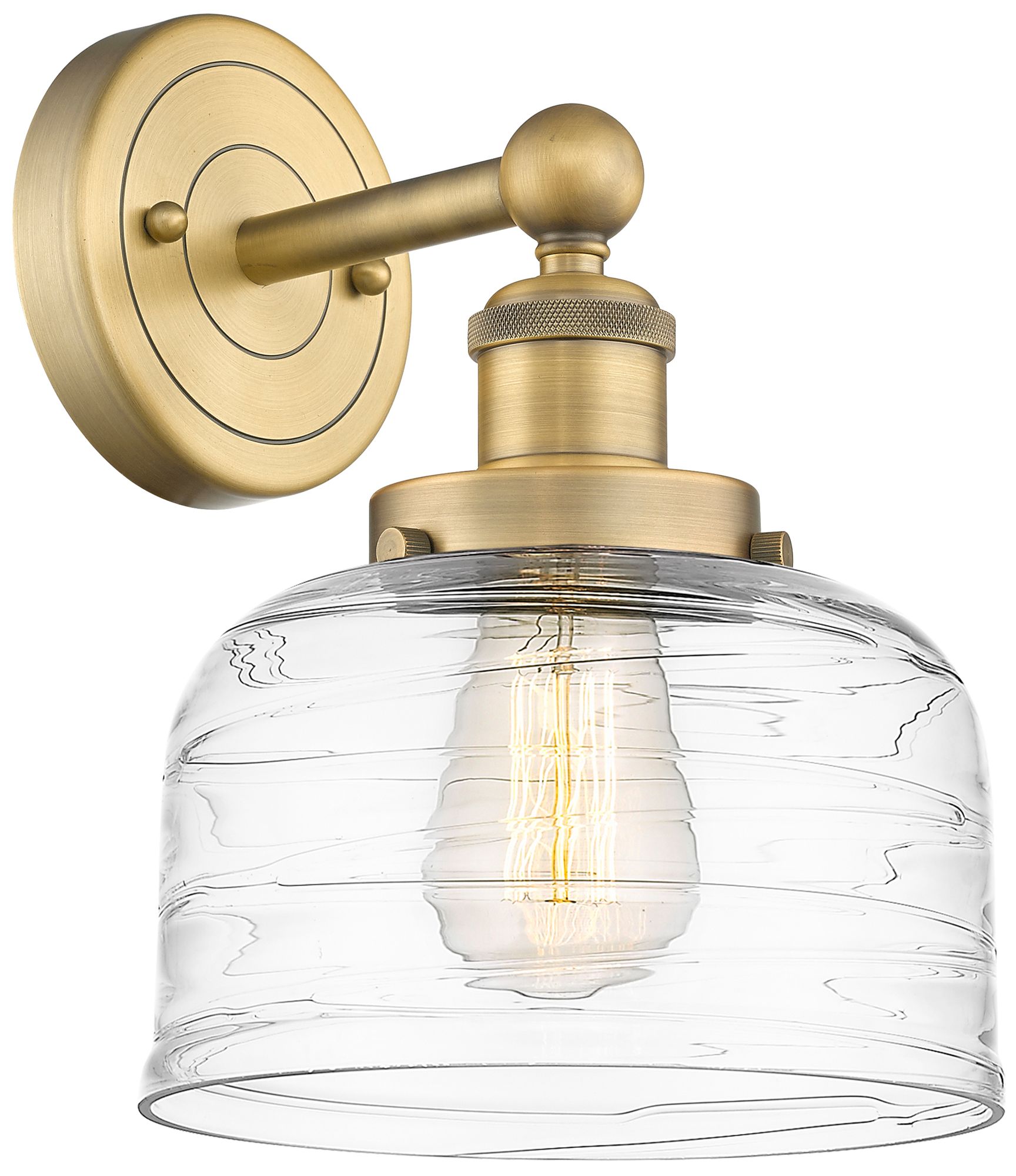 Large Bell 10"High Brushed Brass Sconce With Clear Deco Swirl Shade