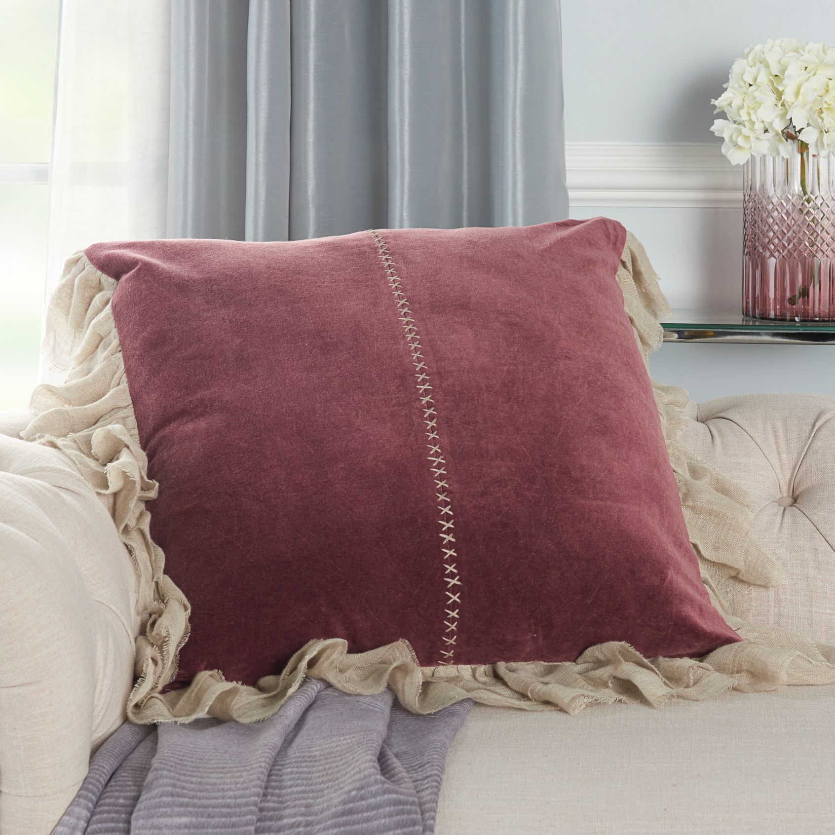 Sofia Burgundy Stitch Velvet Frills 22" Square Throw Pillow