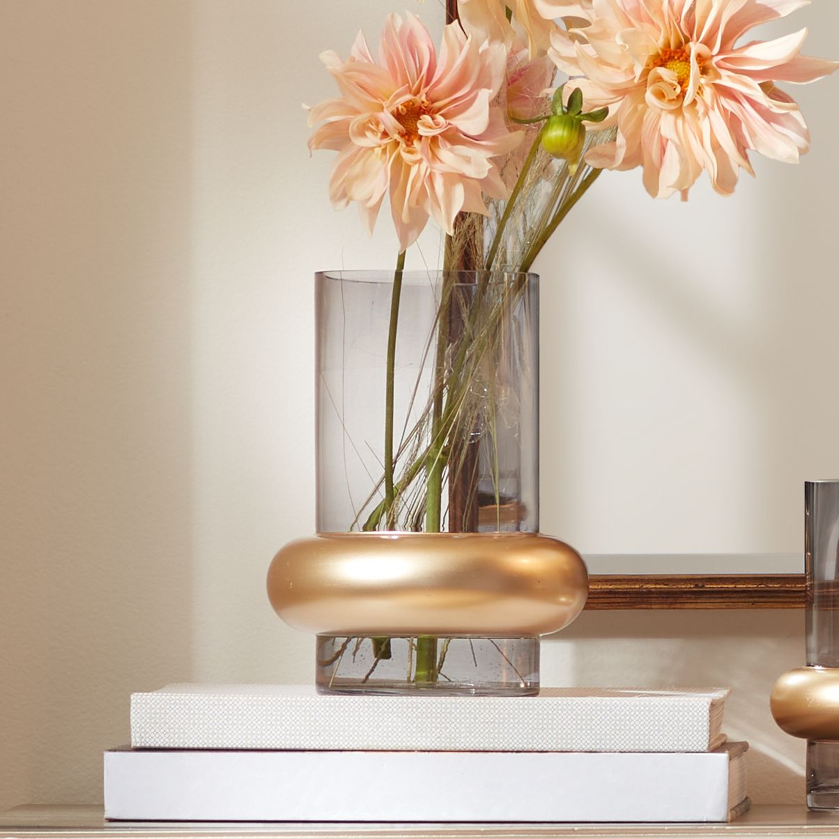 Jaurdi 9" High Clear Brown Glass and Gold Cylinder Vase