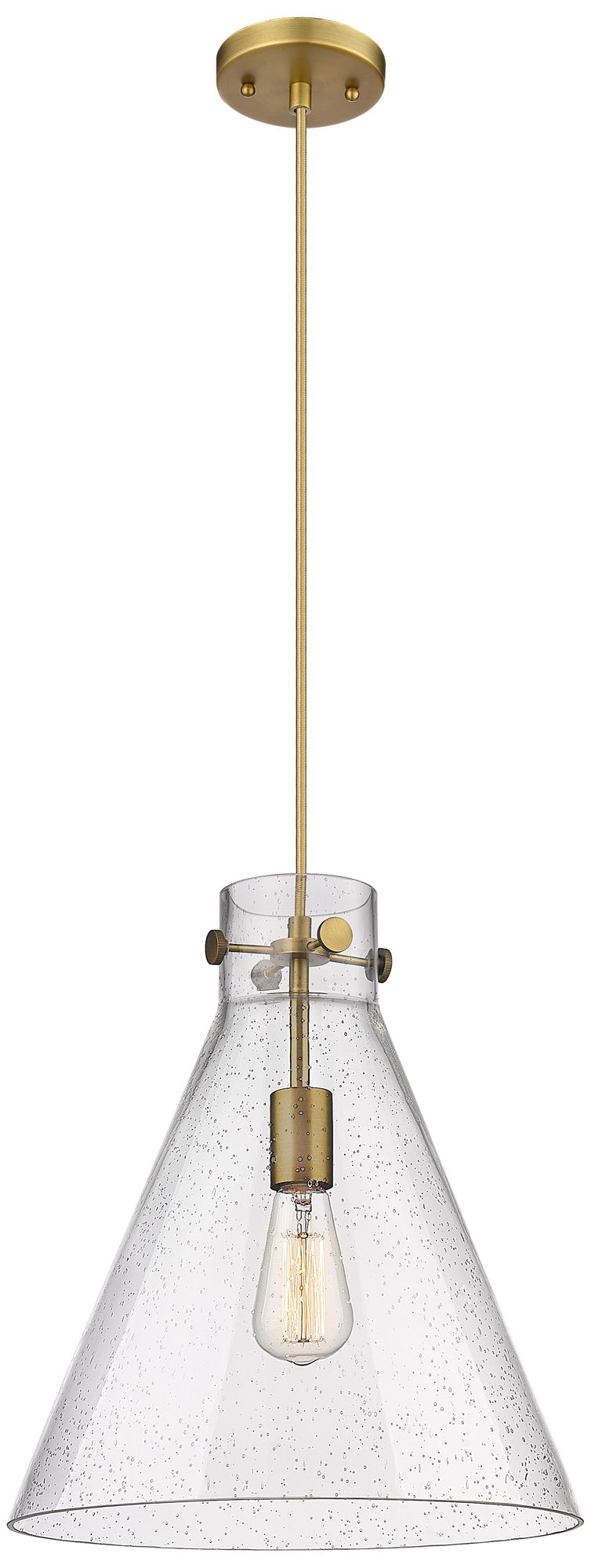 Newton Cone 14" Wide Cord Hung Brushed Brass Pendant With Seedy Shade