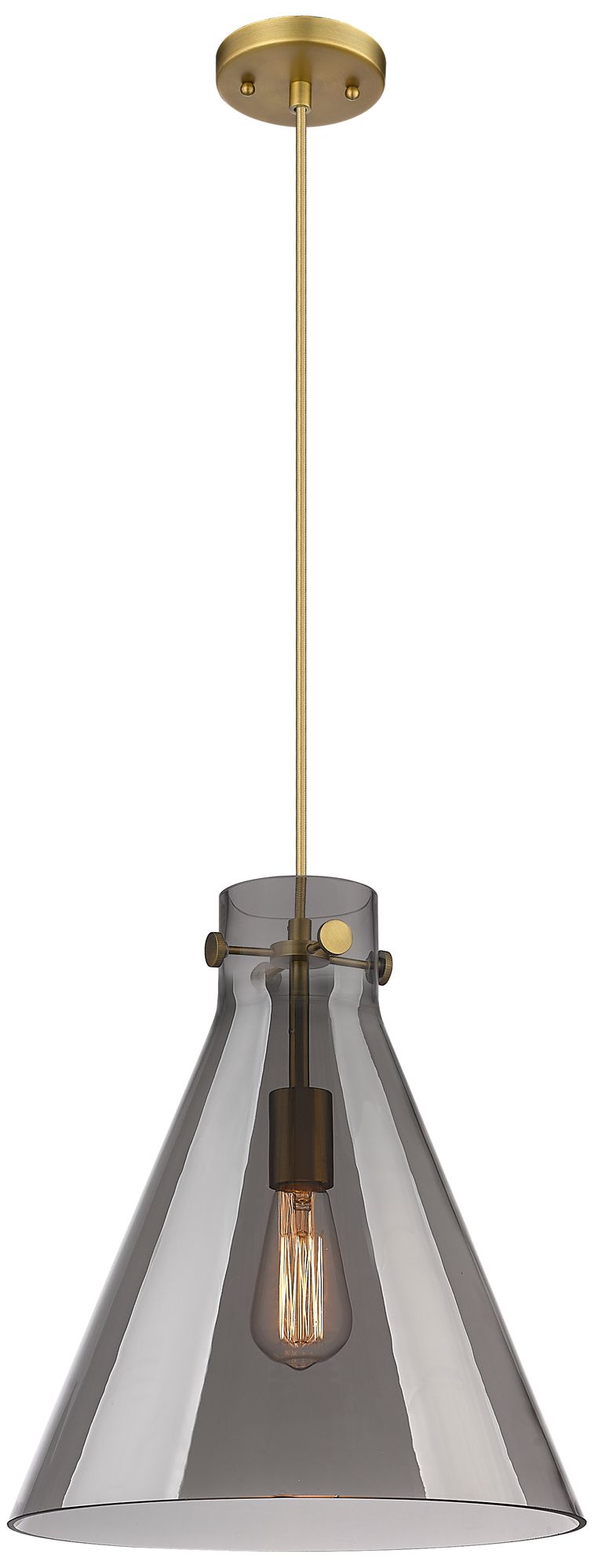Newton Cone 14" Wide Cord Hung Brushed Brass Pendant With Smoke Shade