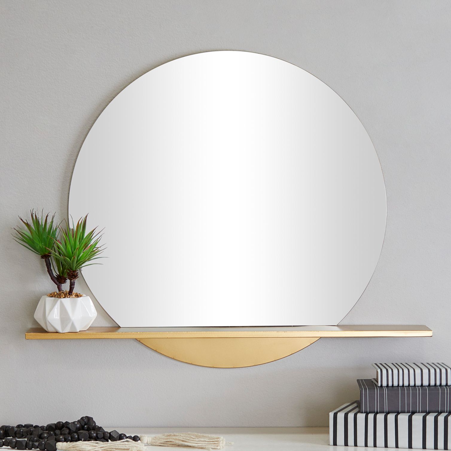 Moonrise Polished Gold Metal 28" Round Shelf Wall Mirror