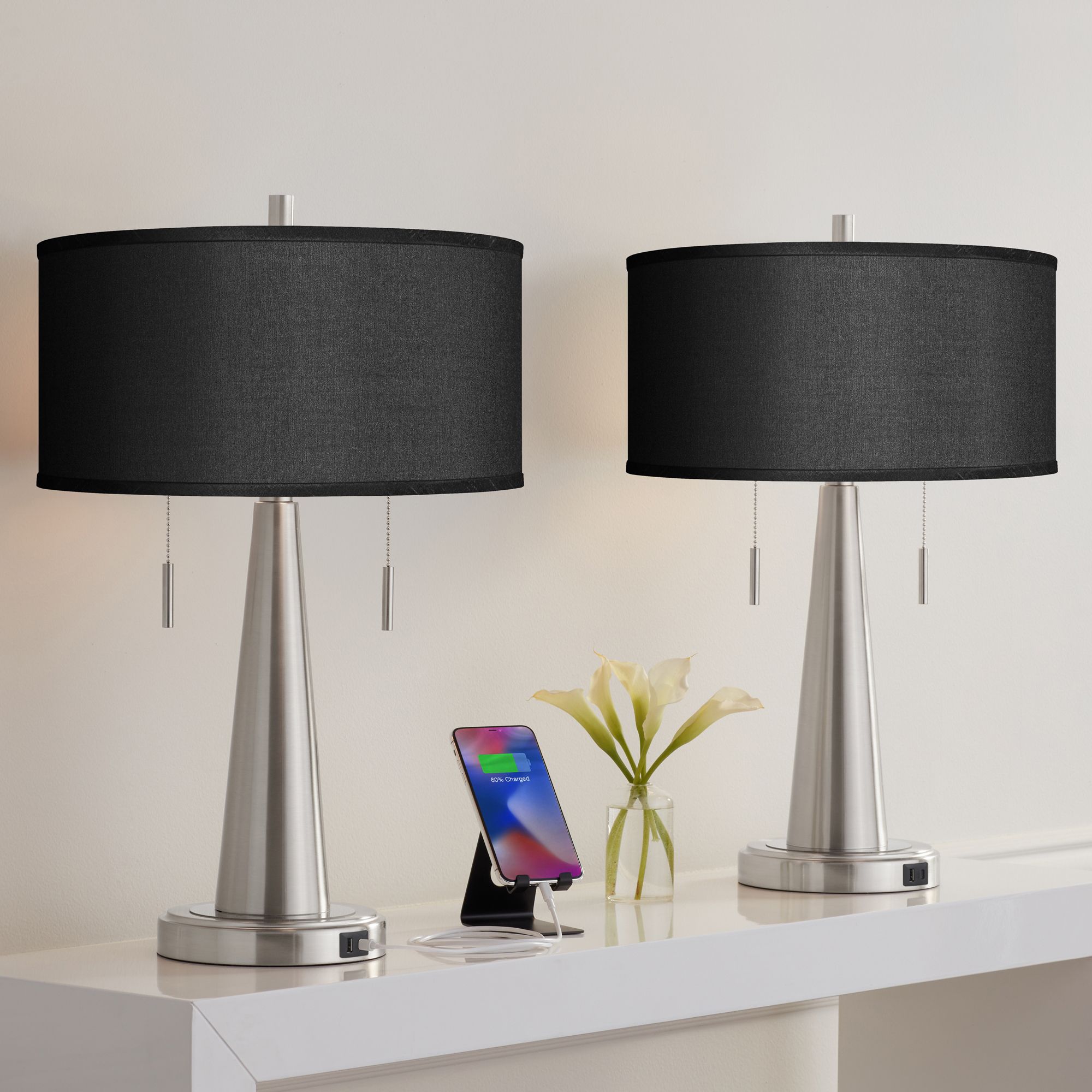 Possini Euro 23" Black Faux Silk Modern USB Table Lamps Set of 2