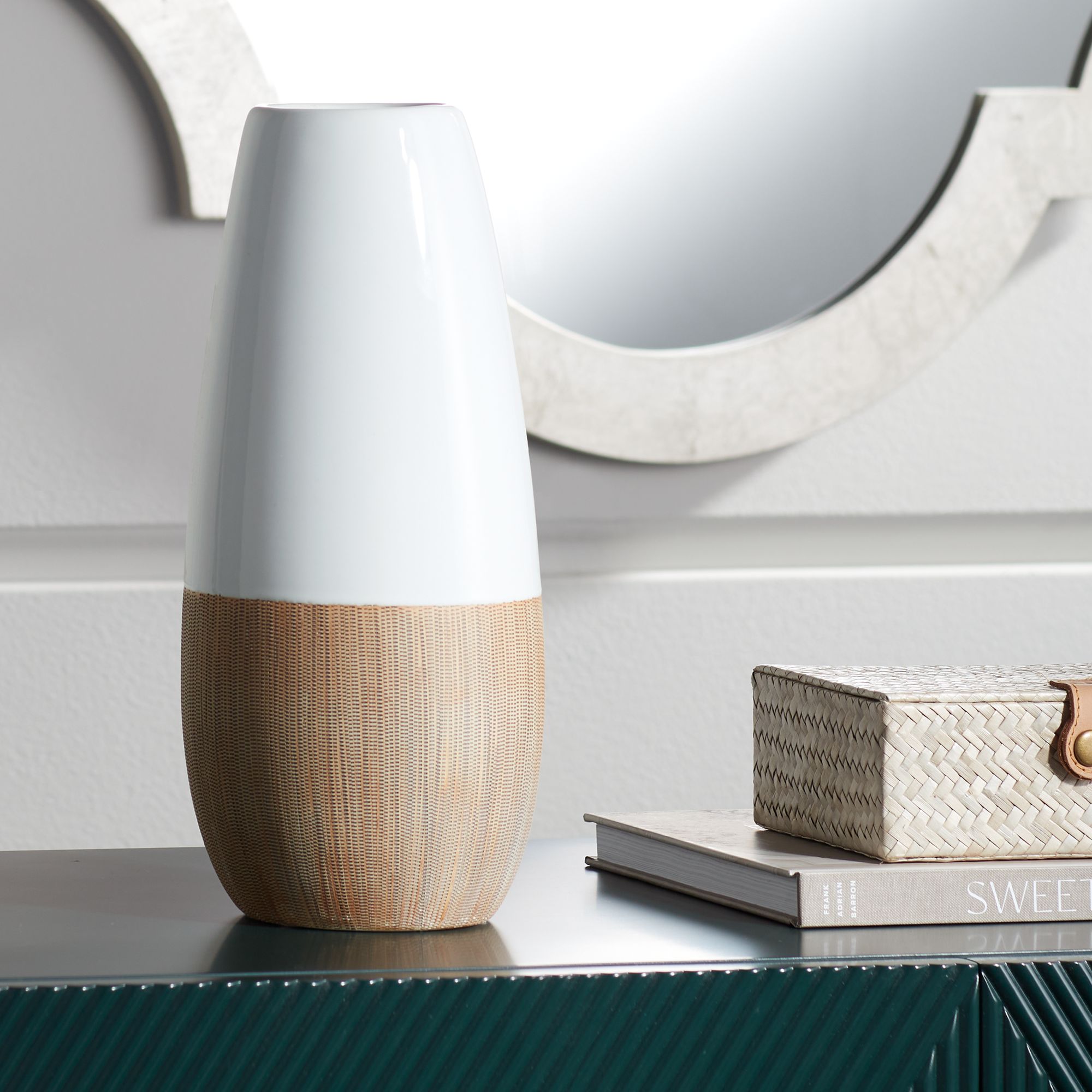 Sadria 12" High Shiny White and Matte Wood Ceramic Vase