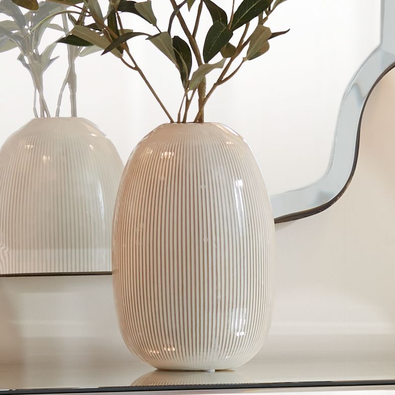 Pilar 6 1/4" High Shiny Beige Ridged Ceramic Vase