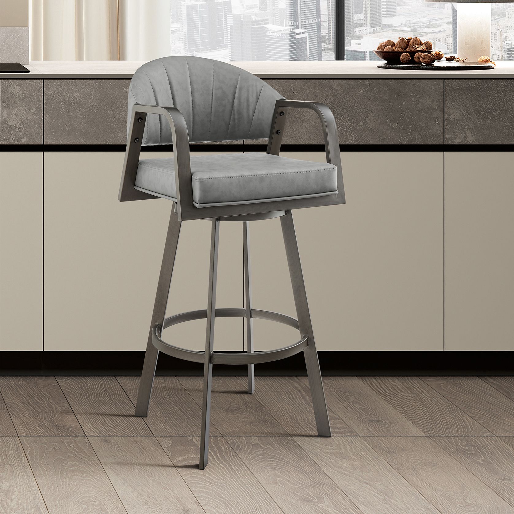 Marcie 26 in. Swivel Counter Stool in Metal and Vintage Gray Faux Leather