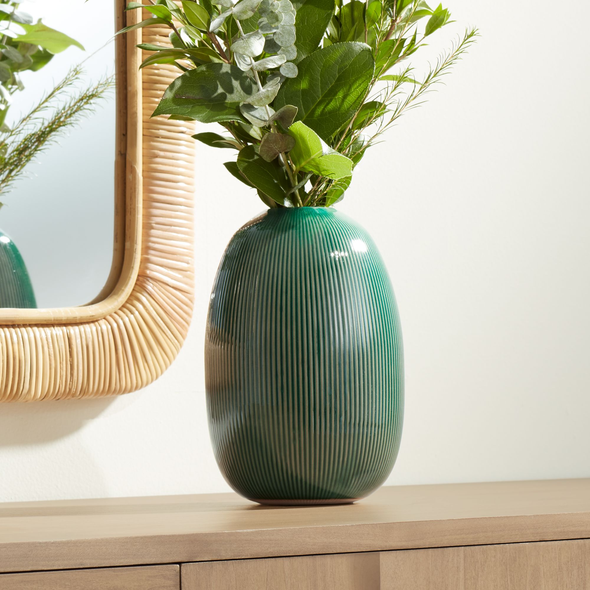 Pilar 8 3/4" High Shiny Green Ridged Ceramic Vase