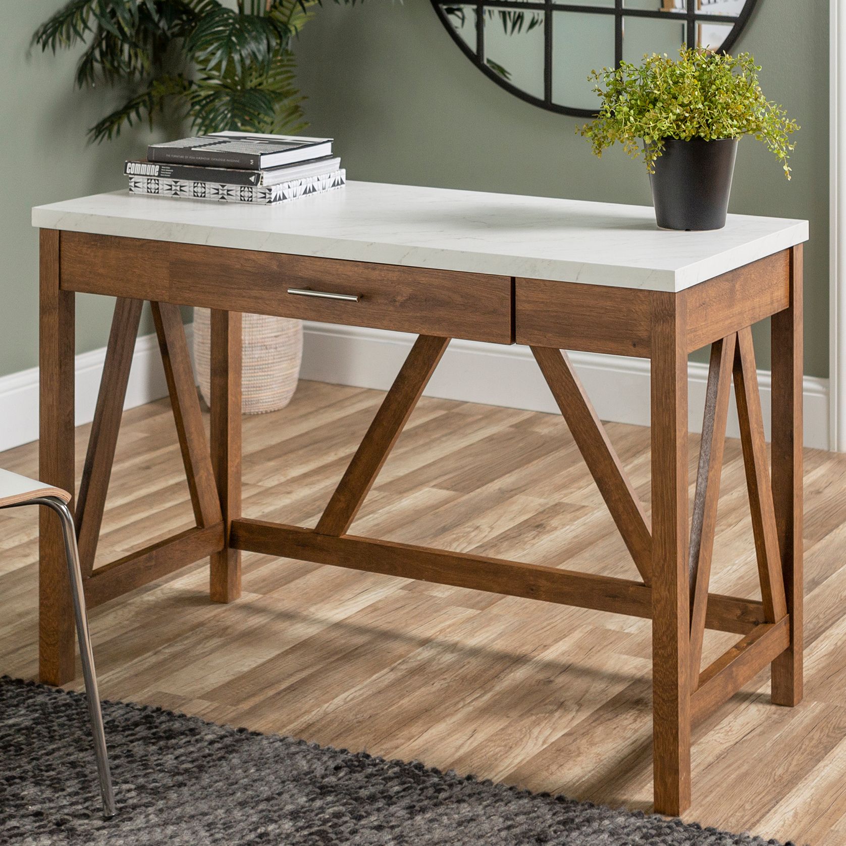 Faux Marble 46"W Natural Walnut Center Drawer Computer Desk