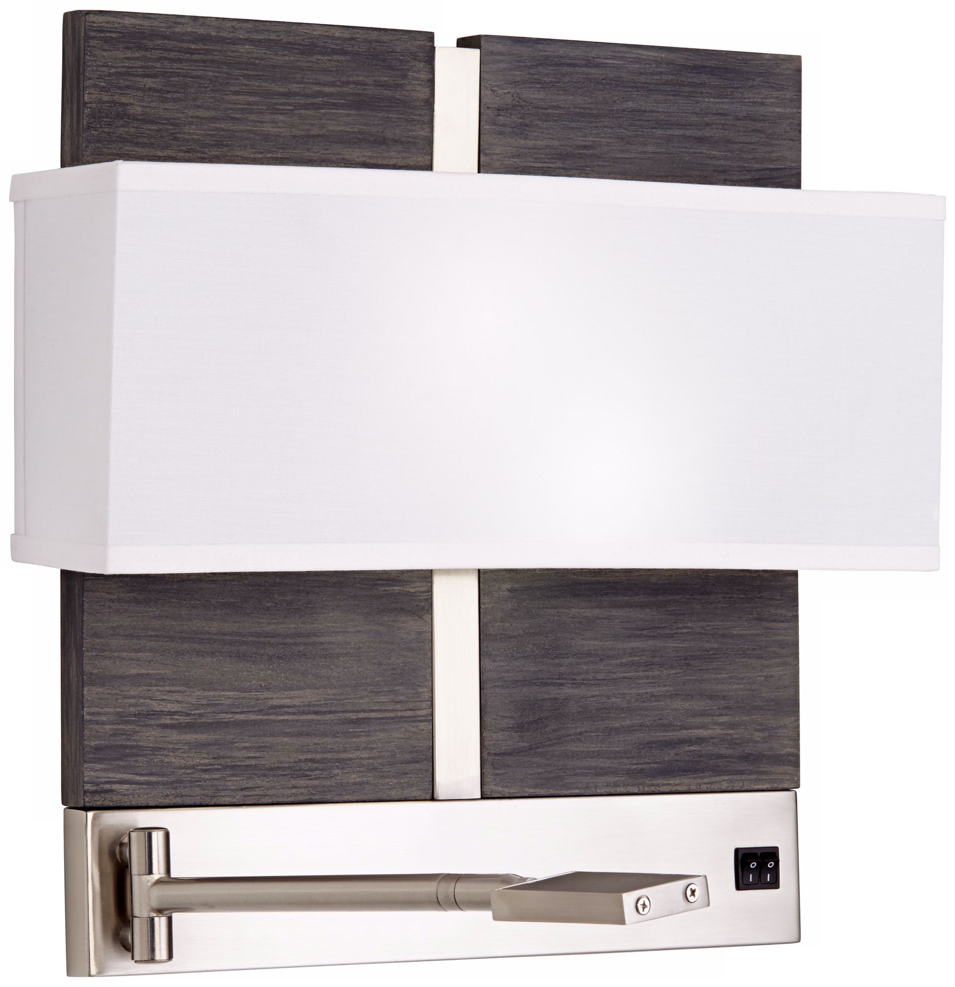 Wall Mounted Nightstand Lamp With Pull Out LED Reading Light, Measures 17" wide by 17" high - Wired With Two GU-24 Sockets with 13 Watt Max Labels to Take Two GU-24 Based CFL or LED Bulbs (Sold Separately. Nice Faux Wood Finish To Match Popular Asian Night Laminate - LED Reading Lamp Extends 12.5" - Dual Rocker Switches Control Both Light Sources - Metal Finish is 99C - Brushed Steel/Nickel - Shade 80-2321-70 Measures 7"H x 17"W by 4" Deep to Maintain ADA Compliance.