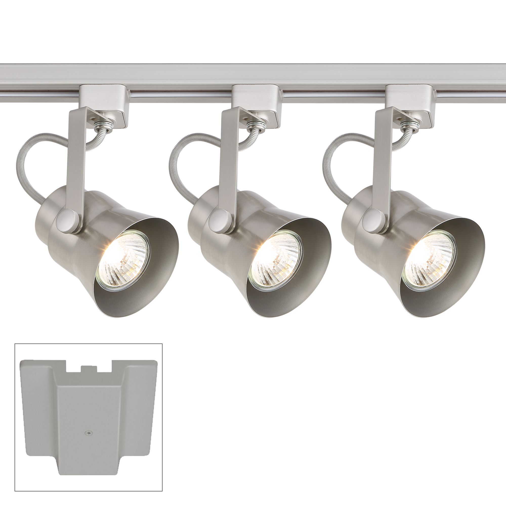 A 4-foot track, drawn steel housing, and a silver finish distinguishes this decorative three-light aluminum track kit with thermoplastic floating canopy. 90-degree vertical aiming capability and 358-degree rotation makes this track lighting head perfect for general illumination and focused accent lighting. This track lighting style fixture easily installs in a junction box like any ceiling or wall light, with mounting hardware included.