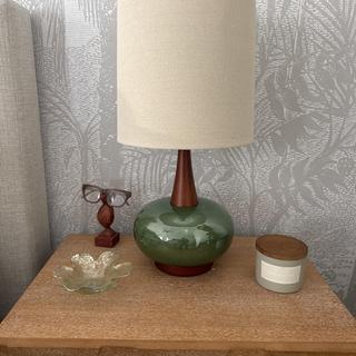 - Ceramic lamp base with a hand-glazed finish in green color tones. Wood neck and accents. Because the base is handcrafted there may be slight variations in color and pattern.