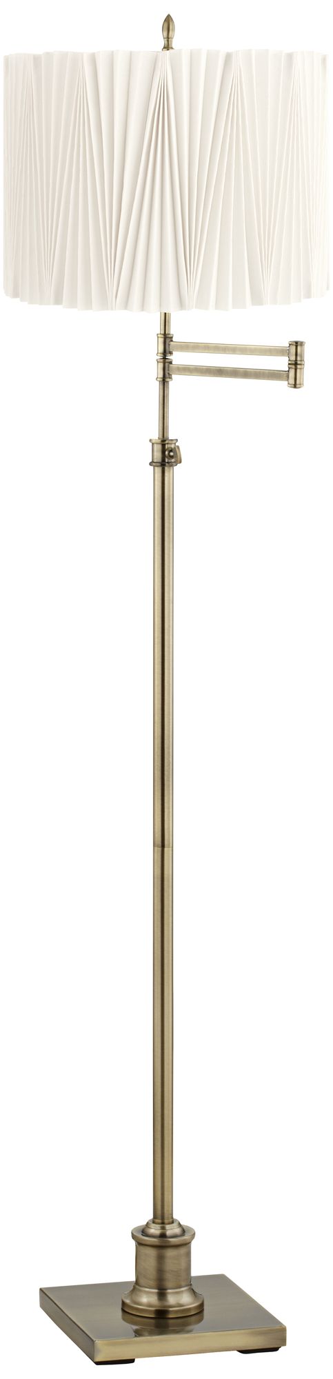 Add style and light with this swing arm floor lamp. The design features a thin profile base and arm. Adjust the arm as needed for reading or other tasks. The lamp can also be adjusted up and down as desired. The lamp comes in an antique brass finish and is topped with an off-white color Brussels linen lamp shade with diamond pleats.