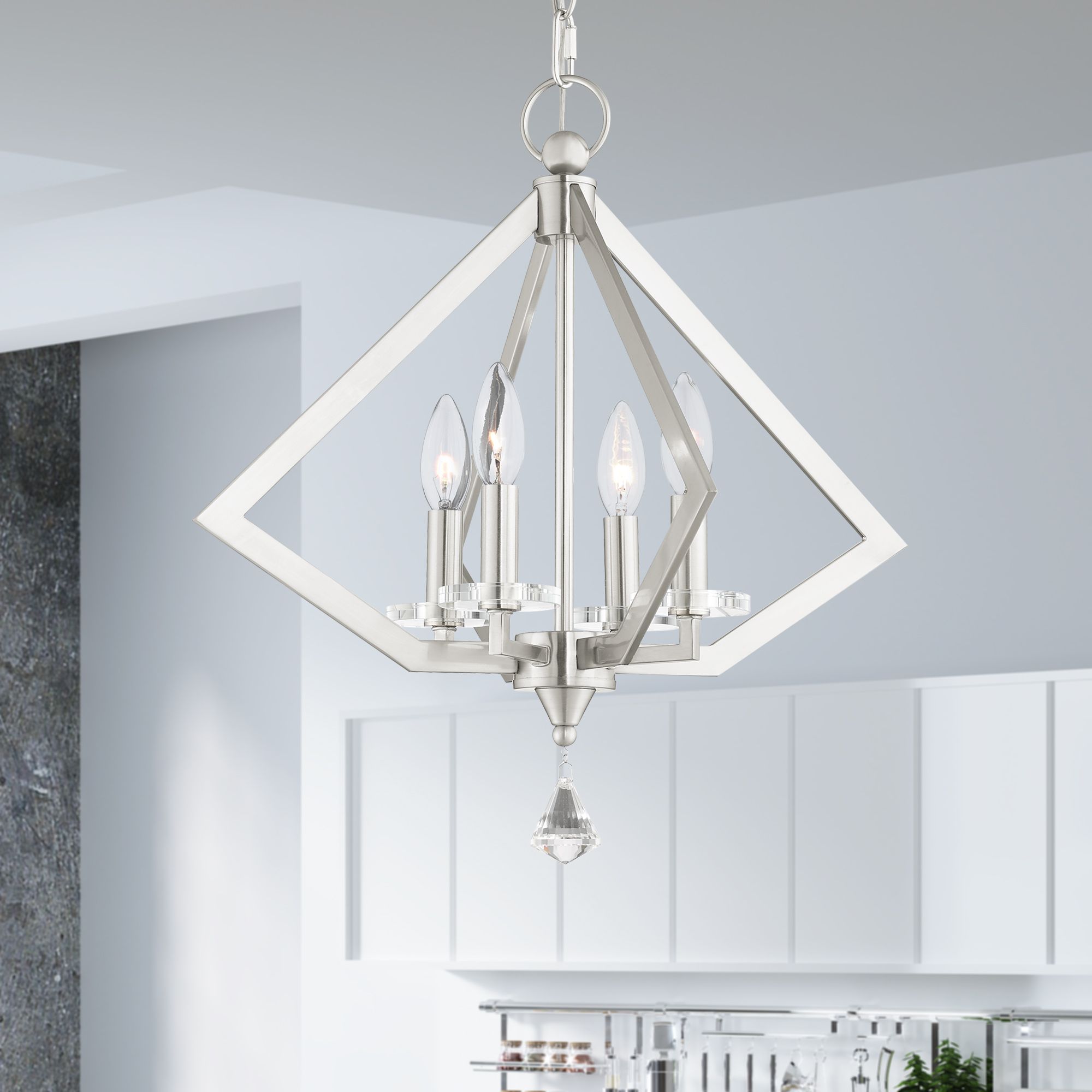 The Diamond four light brushed nickel chandelier lets you explore a new facet of your design sense. Shaped like a diamond, this contemporary four light chandelier is like jewelry for your home's interior.