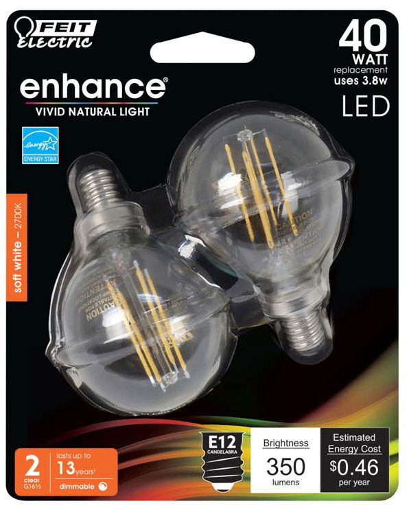 A set of two dimmable LED filament bulbs from Feit Electric, capable of producing 350 lumens on only 3.8 watts. These bulbs are the equivalent of 40 watt incandescent bulbs, and are damp location rated, making them perfect for bathroom vanities. These bulbs come in a clear glass globe shape and a E12 candelabra base. Two bulbs per pack and the price is for two bulbs.