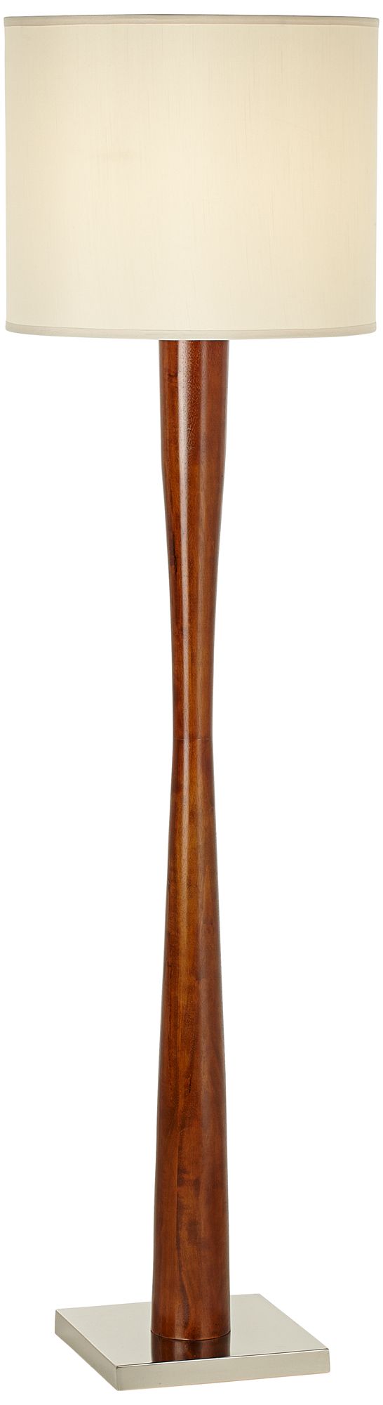 A beautifully warm and glossy finish makes the wood element stand out in this high-gloss walnut and metal floor lamp.
