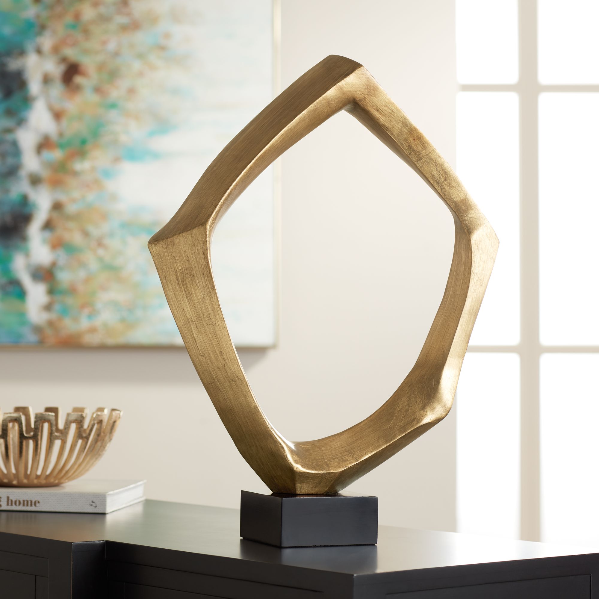 An abstract design with a standout gold leaf finish, this contemporary indoor sculpture is an attractive accent. This indoor figure from Dahlia Studios features a simple, yet standout design. Crafted from resin construction, this piece is handmade and covered with a shiny gold leaf finish.