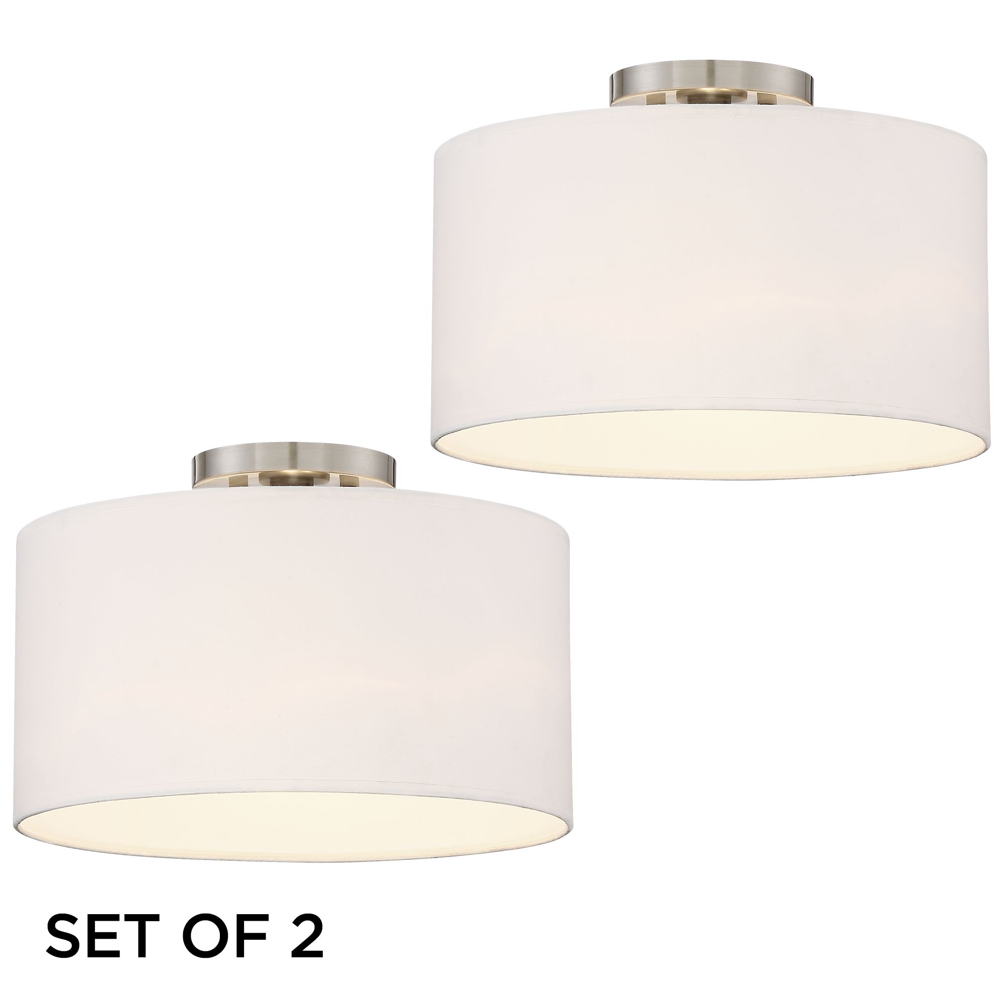 Get this convenient set of two semi-flushmount ceiling lights for your home. Each light comes in a crisp white shade with an open bottom, and attaches to the ceiling with a brushed nickel canopy. This simple, straightforward look is great for any style or setting – contemporary, modern, or minimalist.