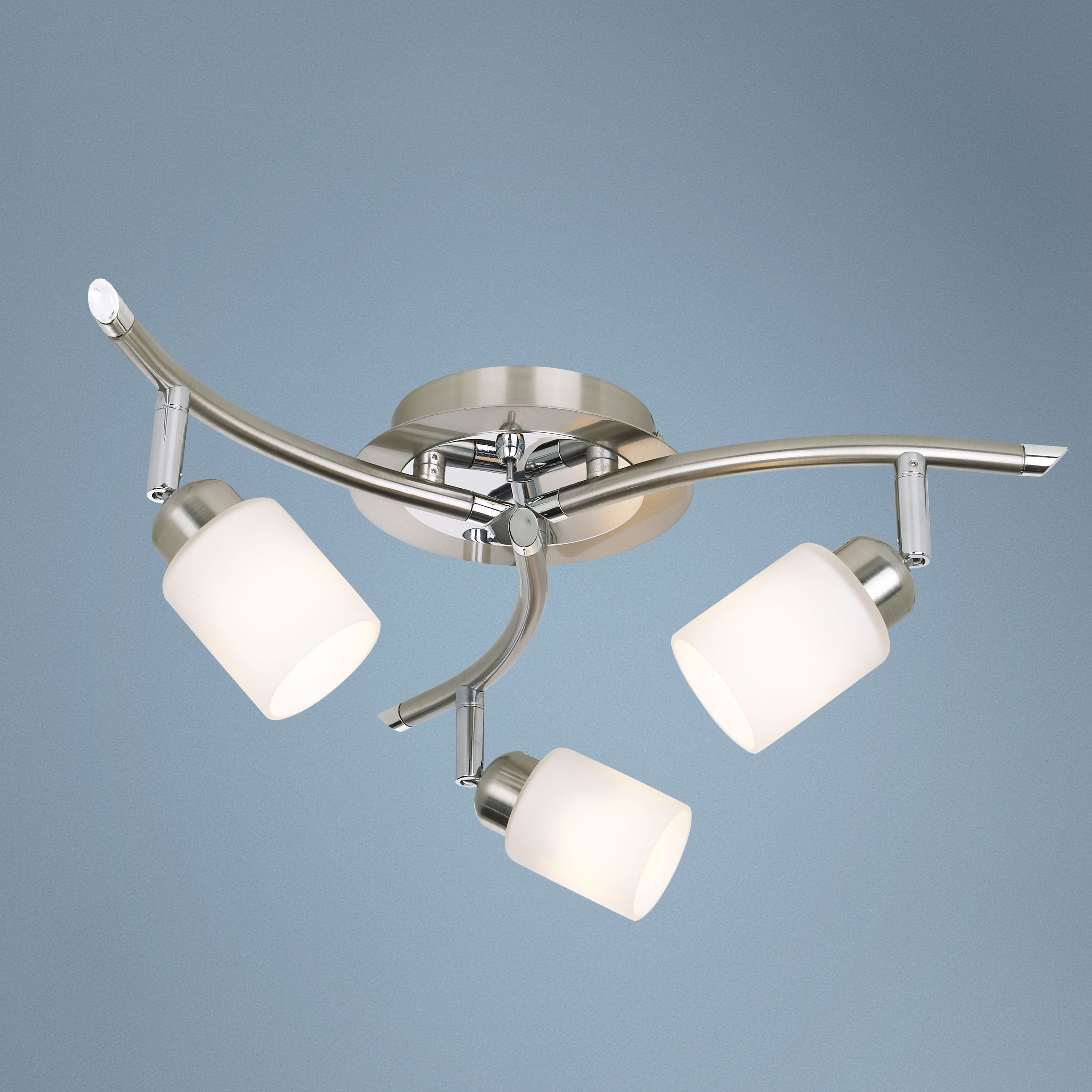 This three light ceiling/wall fixture sports a contemporary look and feel. Features three adjustable, semi-flushmount lights in a brushed steel finish with chrome accents and opal glass. Also has an on/off switch on the base.