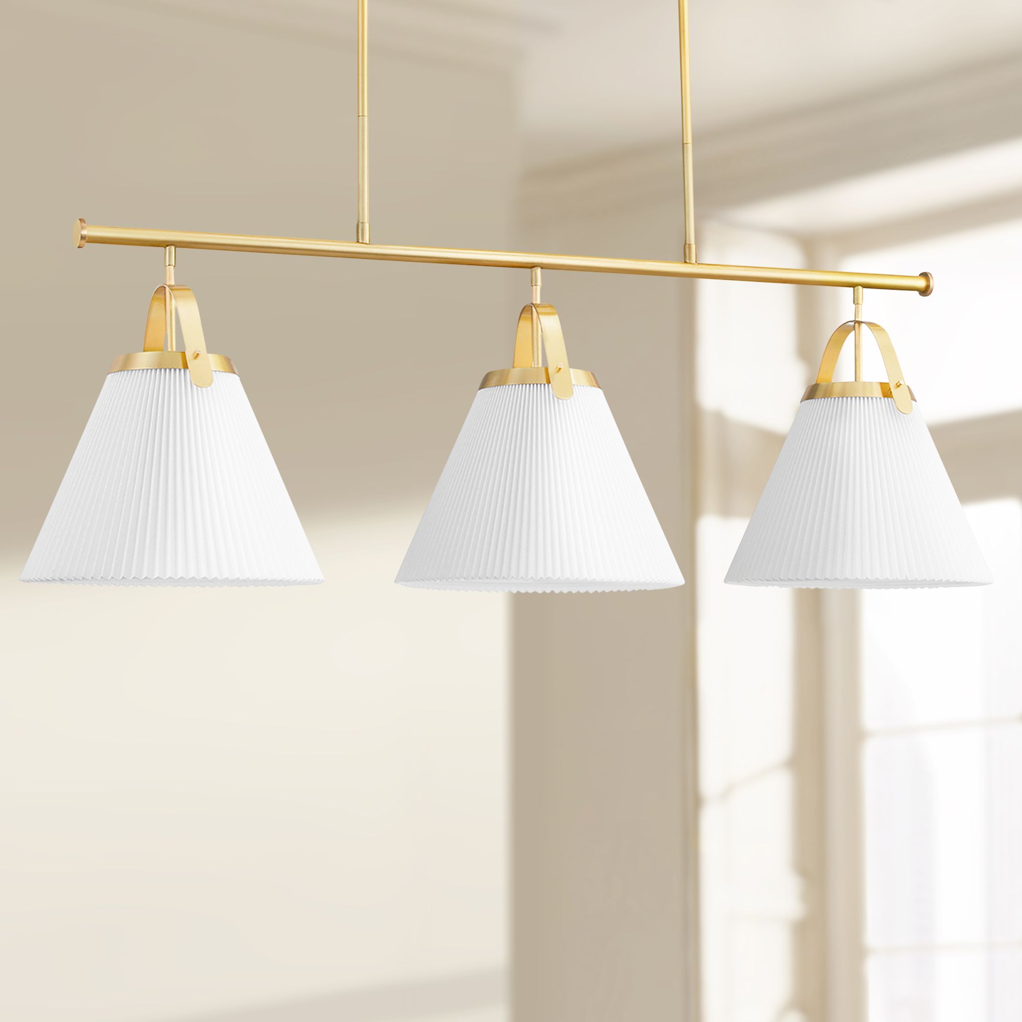 Ensure that your indoor environment is bright, bold and beautiful with the Hudson Valley Aldridge 58" wide aged brass and white island chandelier. This contemporary-style island chandelier is designed with a strong steel body and sleek aged brass finish, making for an ultra-luxurious look. Equipped with a smooth, white Belgian linen shade, this fixture eloquently guides light to the important parts of your space. Energy-efficient and perfect for a modern home, this light will completely change the feel of your kitchen island, kitchen or dining room space.