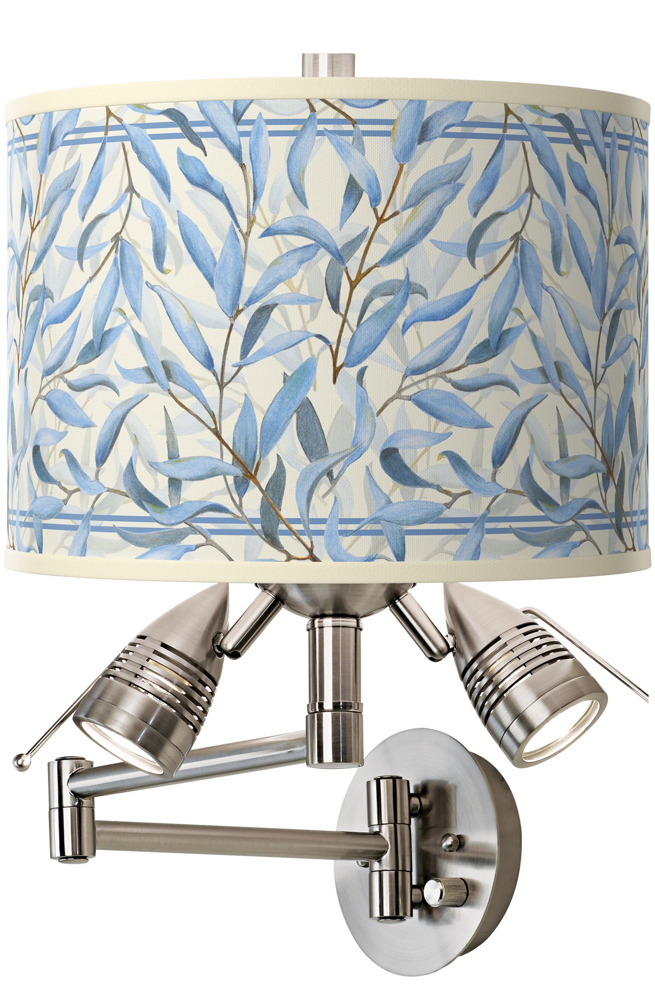 A swing arm wall lamp with a little bit extra, this design adds an extra level of functionality with two adjustable halogen lights. This wall mountable lamp plugs into any standard wall outlet, making the installation a snap. The one incandescent bulb and the two adjustable halogen lights below can be turned on separately for maximum flexibility. This Amity patterned shade design is custom made-to-order. Shade printing process U.S. Patent # 7,347,593.