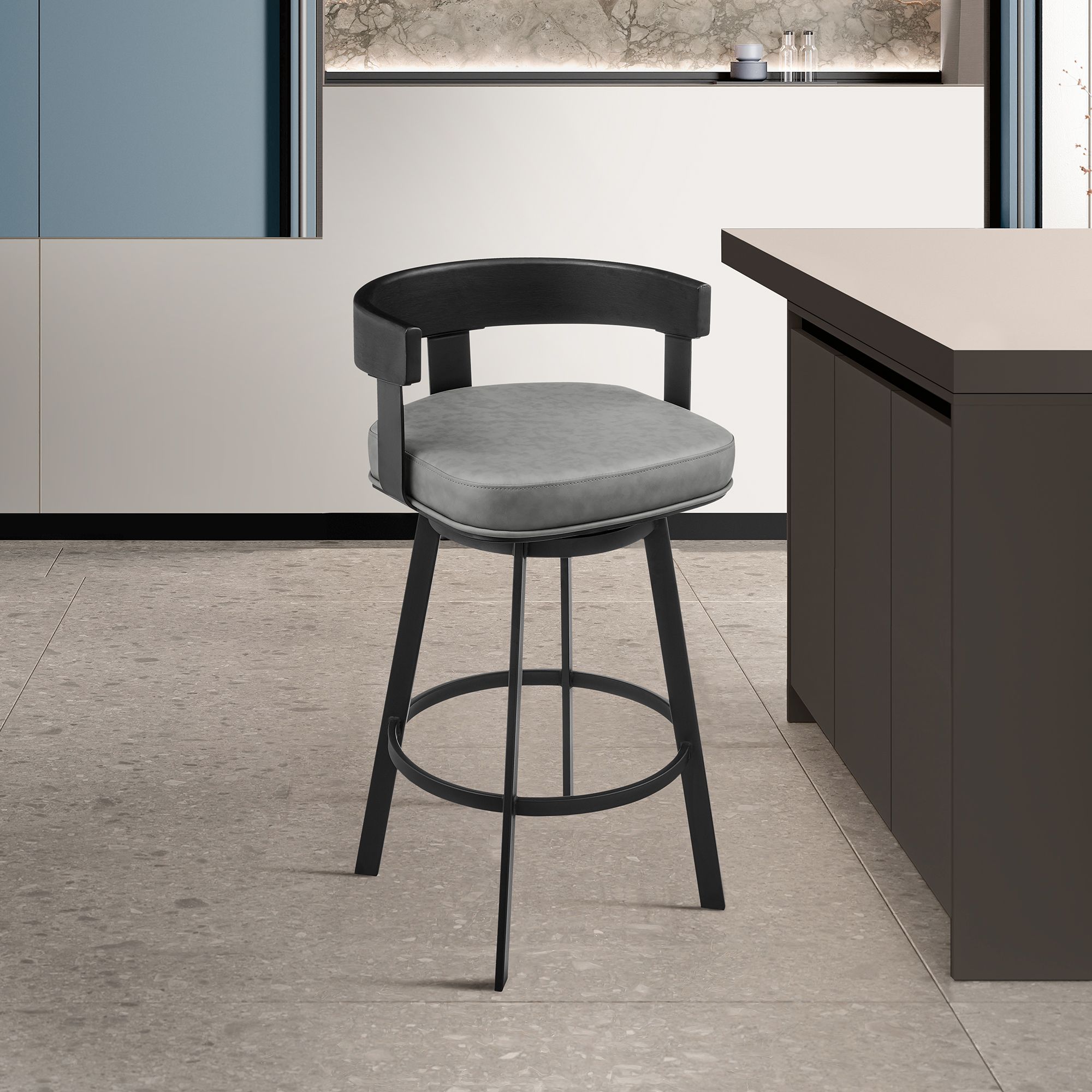 Upgrade your space with the sleek style and charm of the Idris Swivel Counter or Bar Height Stool in Faux Leather and Black Iron by Armen Living. Inspired by mid-century modern design principles, this barstool offers an elevated appearance and exceptional comfort. A refined barrel back envelopes your body, and the thick, high-density cushion offers extraordinary support. Perched upon tapered metal legs, our barstool ensures strength and long-lasting enjoyment anywhere from your kitchen to your home office. The stool includes a built-in circular footrest, and its smooth, 360-degree swivel function enables you to change direction with ease and engage with everyone around you. The Idris Swivel Counter and Bar Height Stool is available in Black Iron with your choice of a Black wood or classic Walnut finish accent with Vintage Gray or Vintage Black faux leather upholstery, providing versatile options to perfectly complement your home decor.