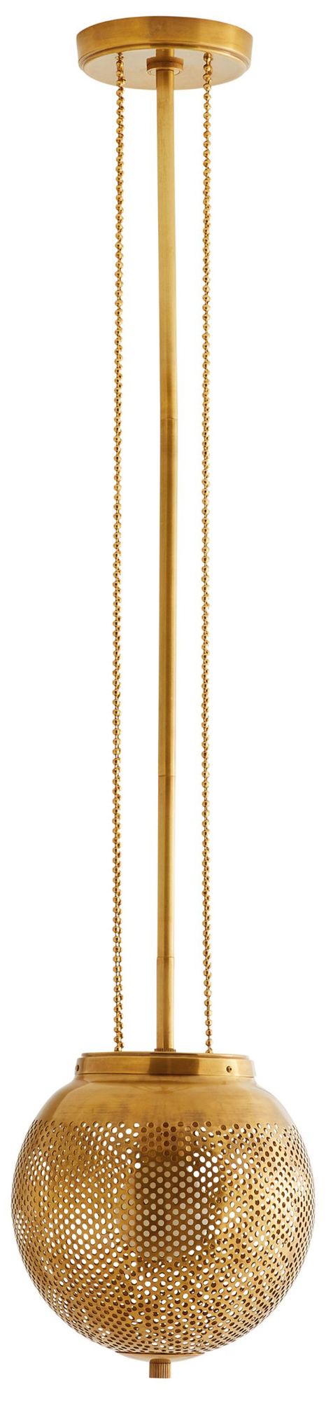 The Tapio Small Pendant suspended from chains creates a beautiful glow through perforated iron finished in vintage brass. Group them over a kitchen island or hang a pair over bedside tables. Additional chain available (CHN-264).
