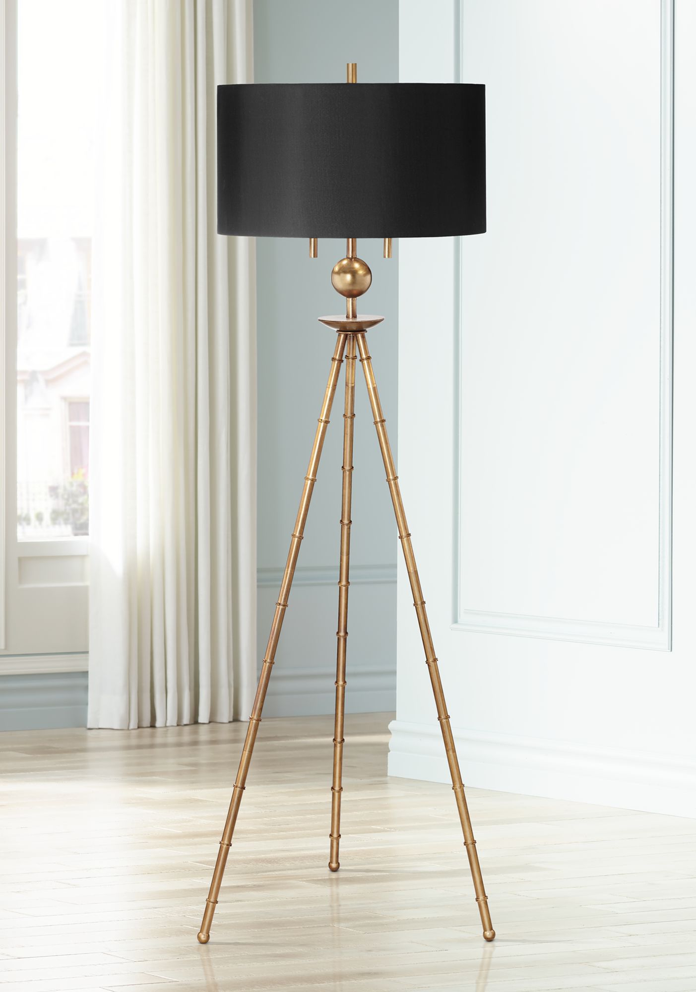 A wonderful bamboo-look tripod stand gives a distinctive look to this antique gold leaf floor lamp. Its metal design includes a ball accent beneath its large black faux silk drum shade. With two lights that operate independently by twin pull chains.