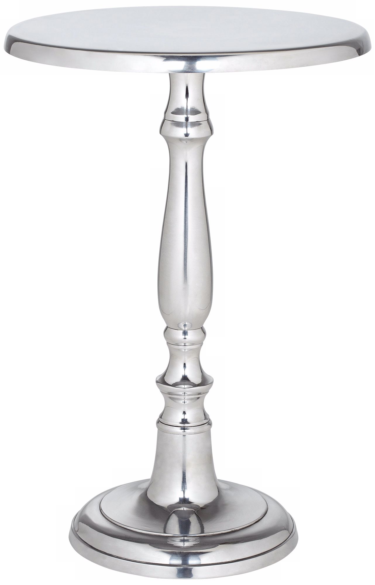 A traditional style, round-top accent table with a candlestick style base. The classic look is made modern with a gleaming, polished aluminum finish. Shimmering as a living room, dining room or entry table, the dazzling look of this piece is sure to catch the eye.