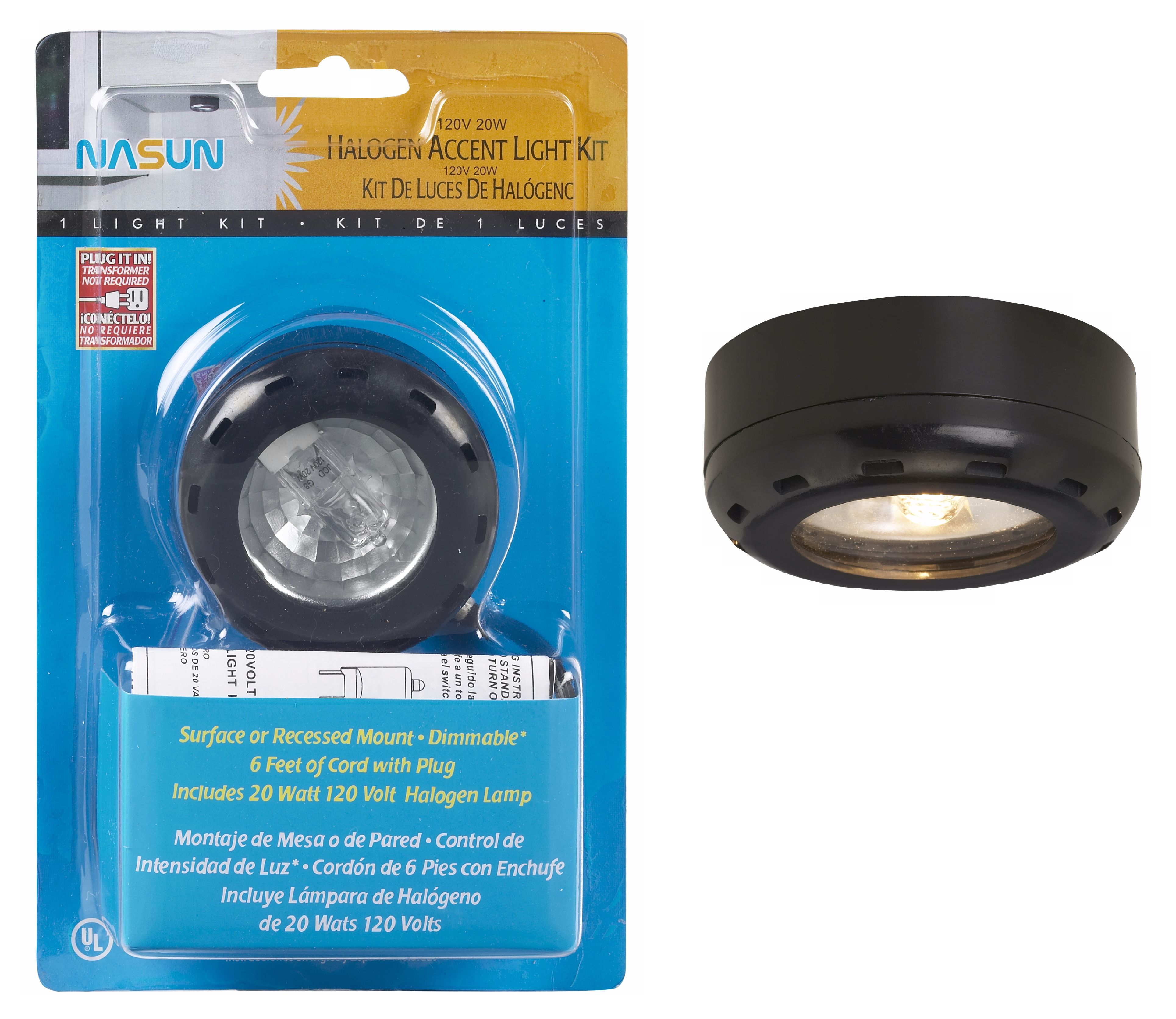 Add this black finish single halogen puck light to small areas such as closets or kitchen cabinets. The design is compact and can be surface or recessed mounted. It's dimmable, and includes cord and all mounting hardware.